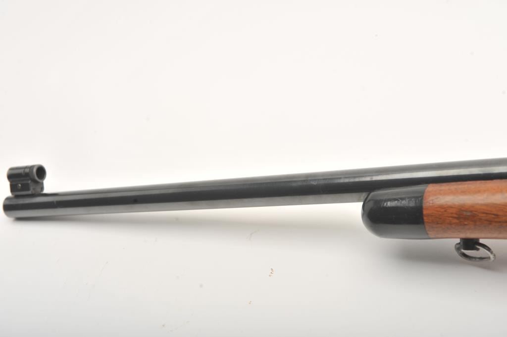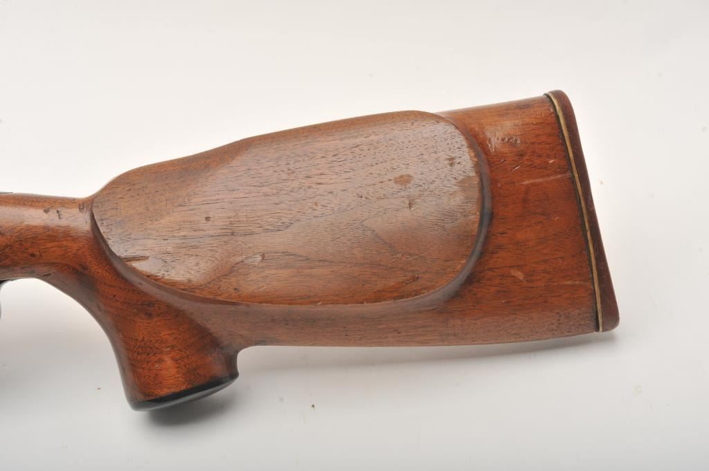 US Springfield Armory Model 1903 bolt action target rifle, .30 caliber, Serial #1341446. The rifle is in good overall condition with a 26”: bull barrel with a hooded globe style front sight. The metal surfaces retain the majority of their polished blue finish with small mars and loss of finish at the muzzle. A period Lyman aperture sight has been added during the period of use. The smooth wood custom target stock is in good condition with mars and scratches consistent with field use. The stock features a beaver tail fore end with an ebony cap and red rubber recoil pad. The bore is good, the action crisp and markings are sharp. Est.: $300-$600. (C+R).