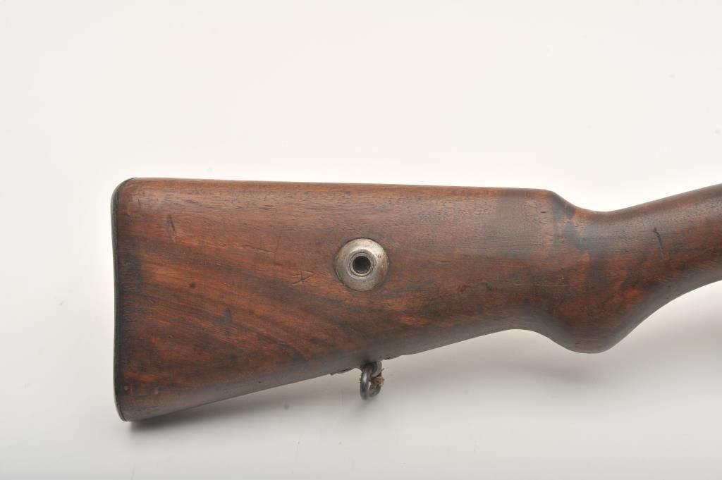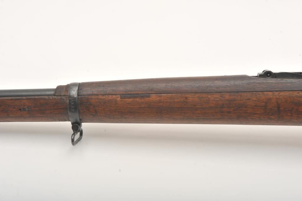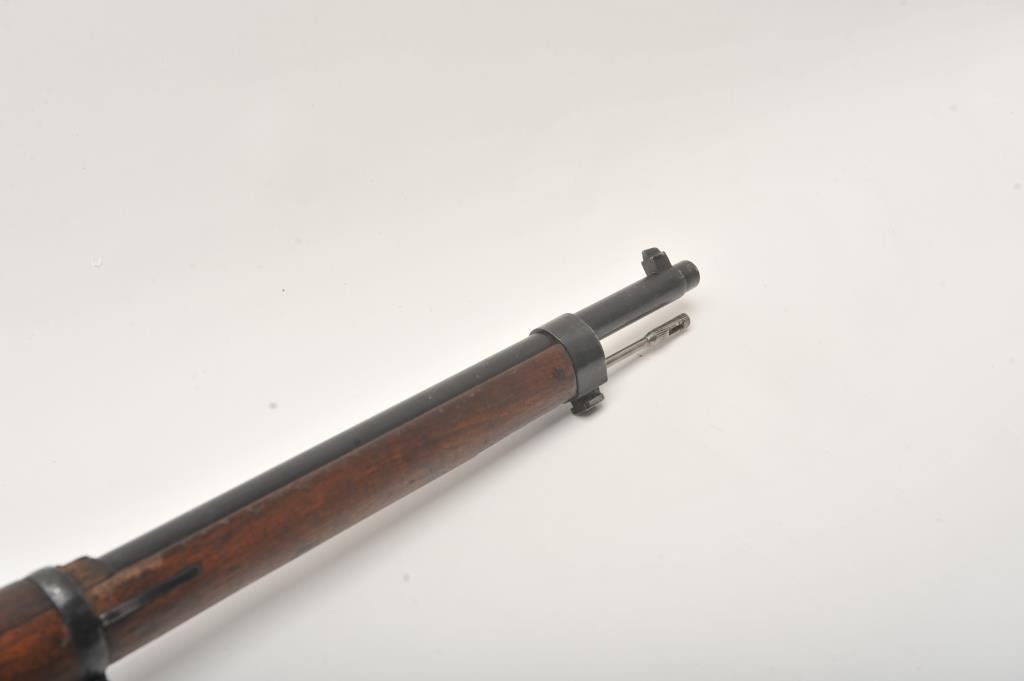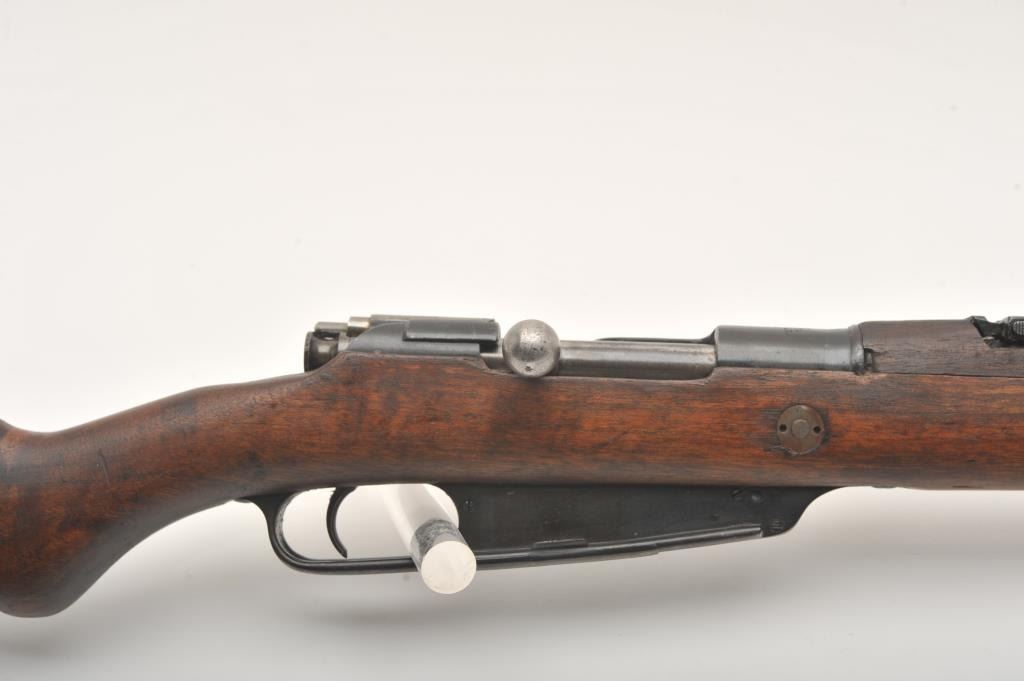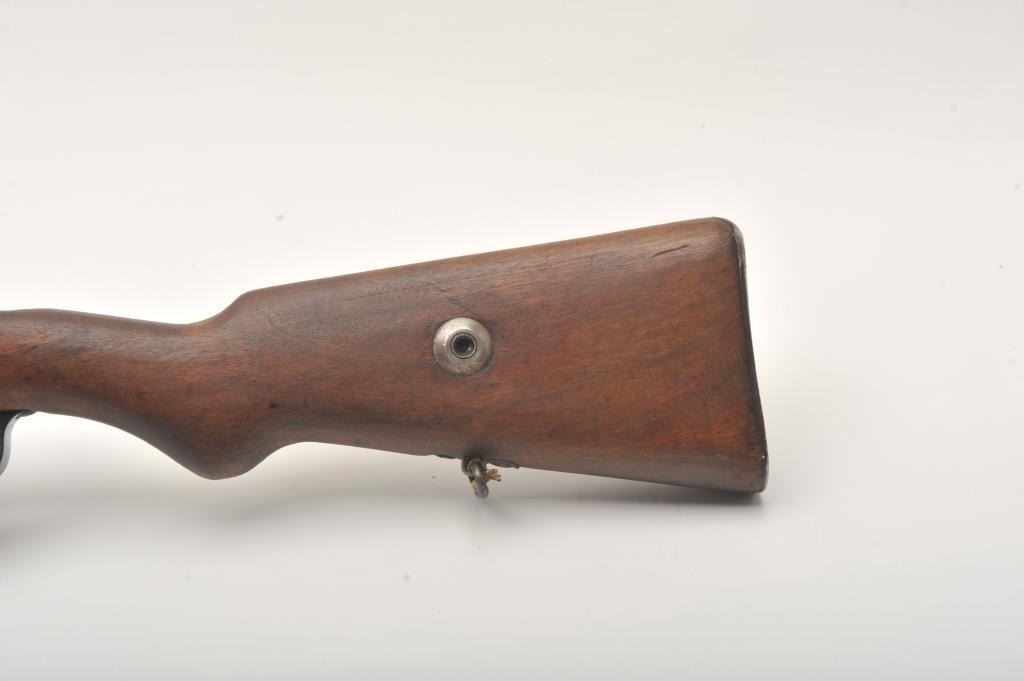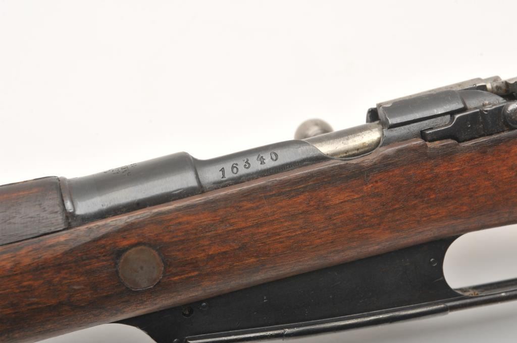Turkish Mosin-Nagant Model 91/30 bolt action rifle, 7.62 x 54R caliber, Serial #16340. The rifle is in good overall condition with a 30” barrel with a blade front and military style tangent rear sights. The metal surfaces retain the majority of their blue finish with small scratches and mars from carry and use. The front ring is marked Ankara with the Turkish crest. The smooth wood stock is in good condition showing moderate wear and use. The butt stock features sling swivels and ends with a smooth steel butt plate. The bore is fair, the action functions and the markings are legible. Est.: $250-$500. (Antique).