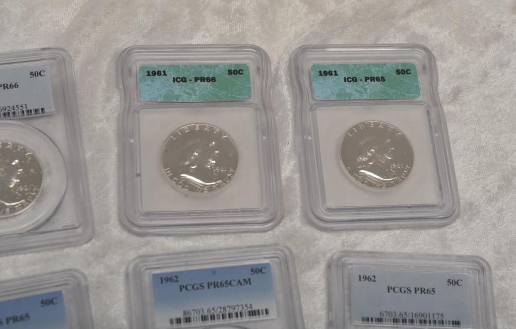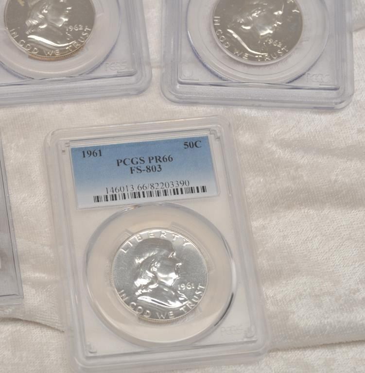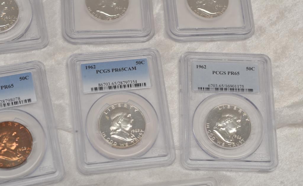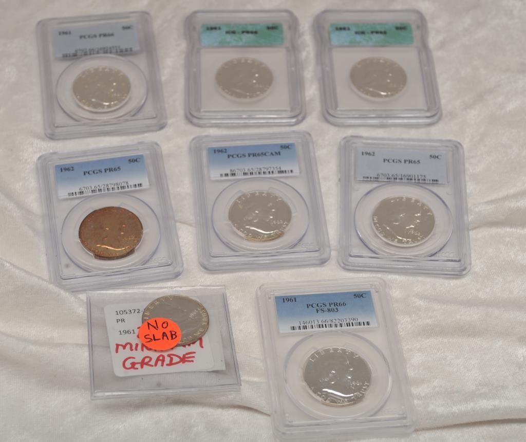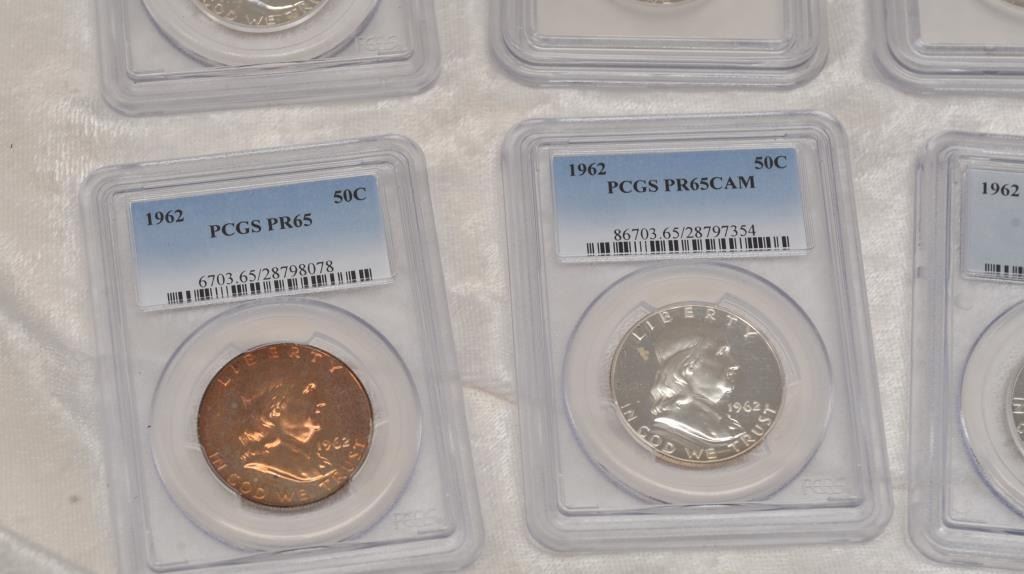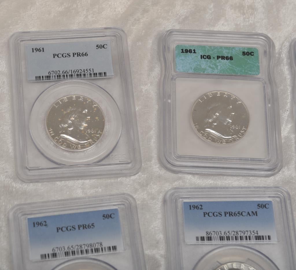 Lot of 8 Franklin Silver Half Dollars: 1. 1963 PCGS PR-66 FS 803 - gem like 2. 1962 PCGS PR-65 3. 1961 PCGS PR-66 4. 1961 IGC PR-65 5. 1962 IGC PR-65 6. 1961 IGC PR-66 7. 1962 IGC PR-65 CAM 8. 1961 - about UNC - not graded Est. $250-500