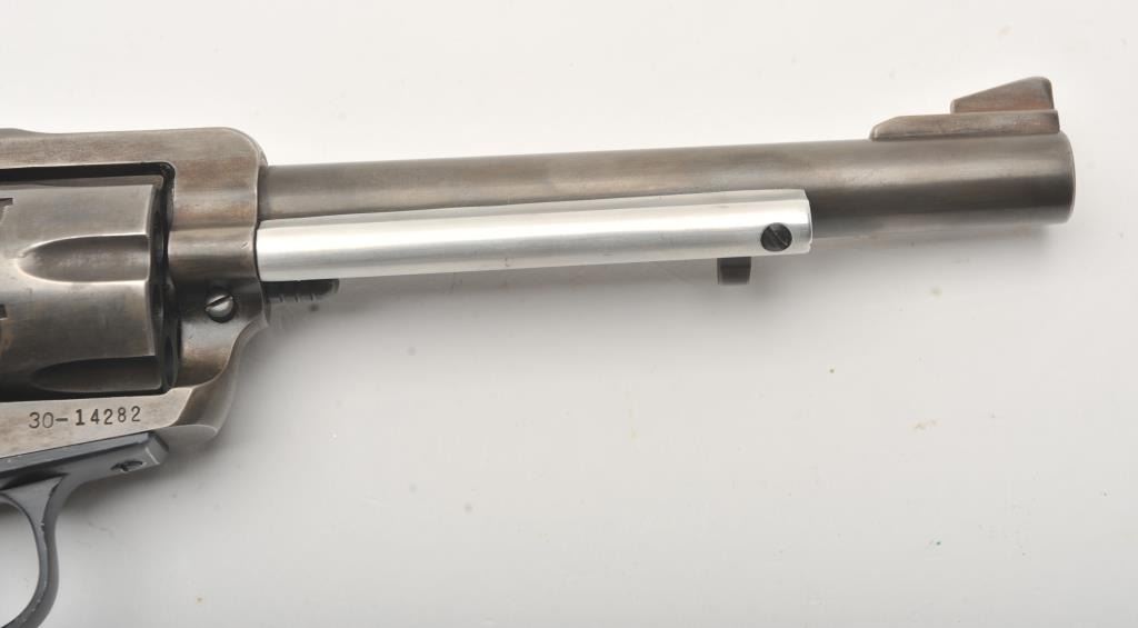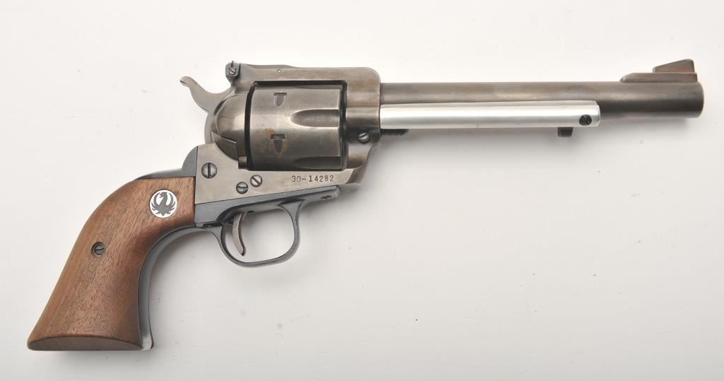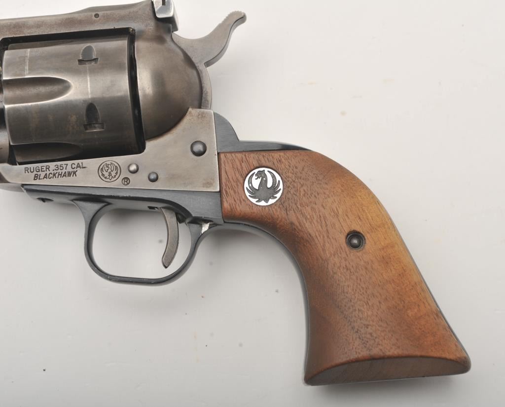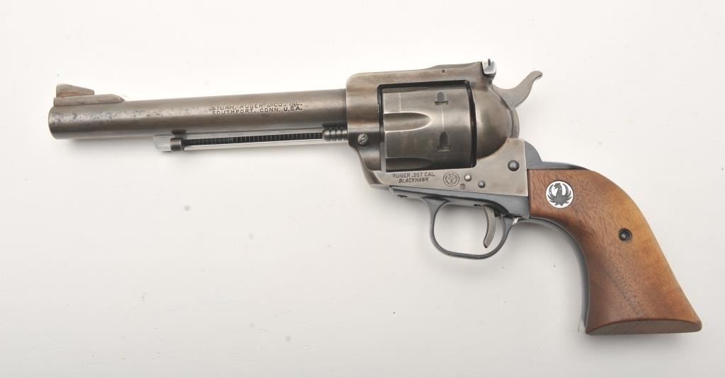 Ruger Blackhawk single action revolver, .357 Magnum caliber, 6.5” barrel, blued finish chemically removed with metal surfaces gone to a brown/grey patina, smooth wood medallion grips, early no transfer bar variation, S/N 30-14282; overall fair to good condition showing some scattered spots of erosion, crisp action, sharp markings, bright bore, good grips. Accompanied by a modern non-factory hard carry case. (Modern/C&R). Est.: $150-$300.