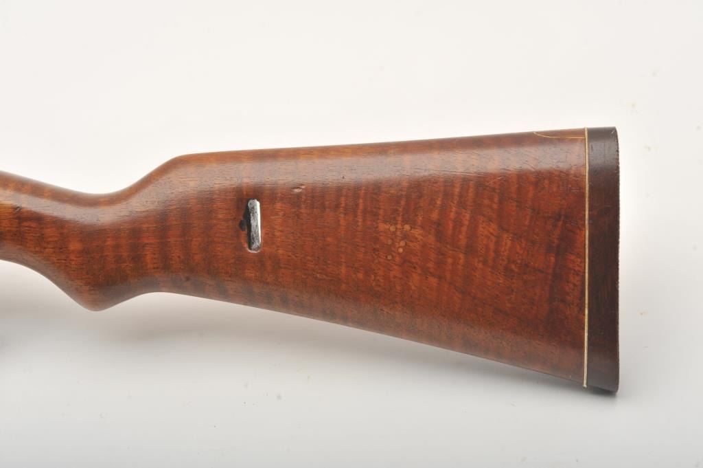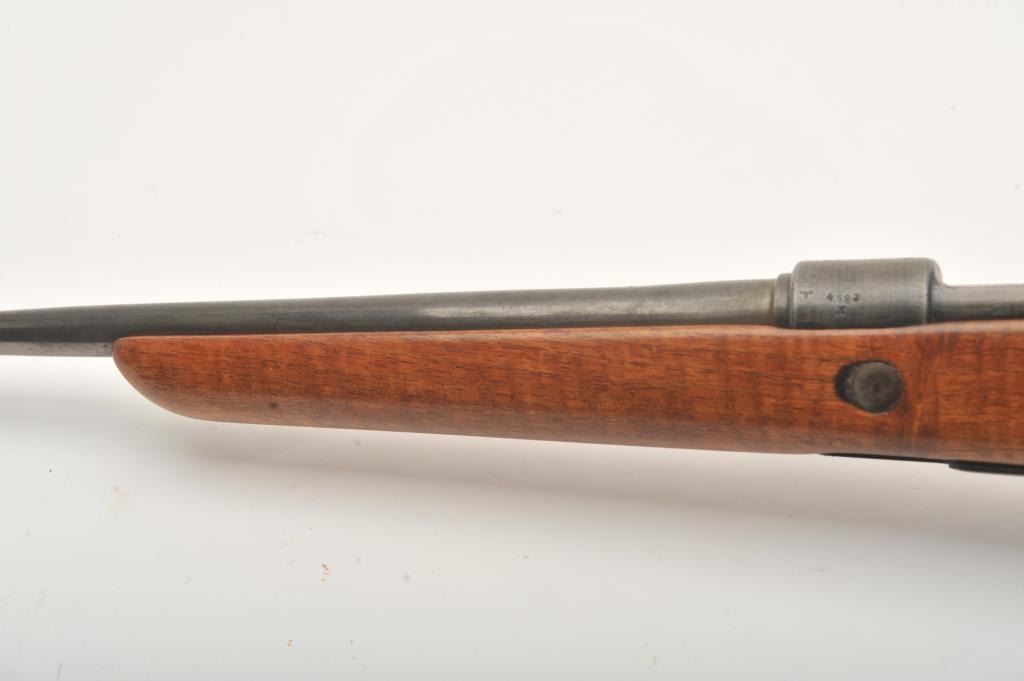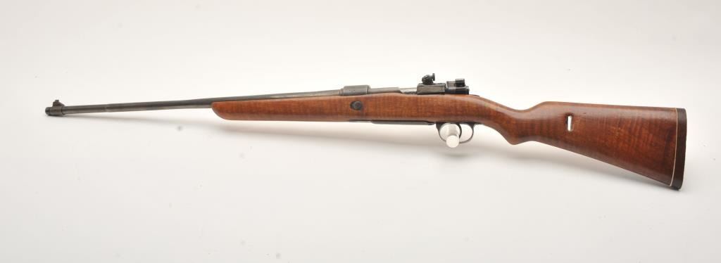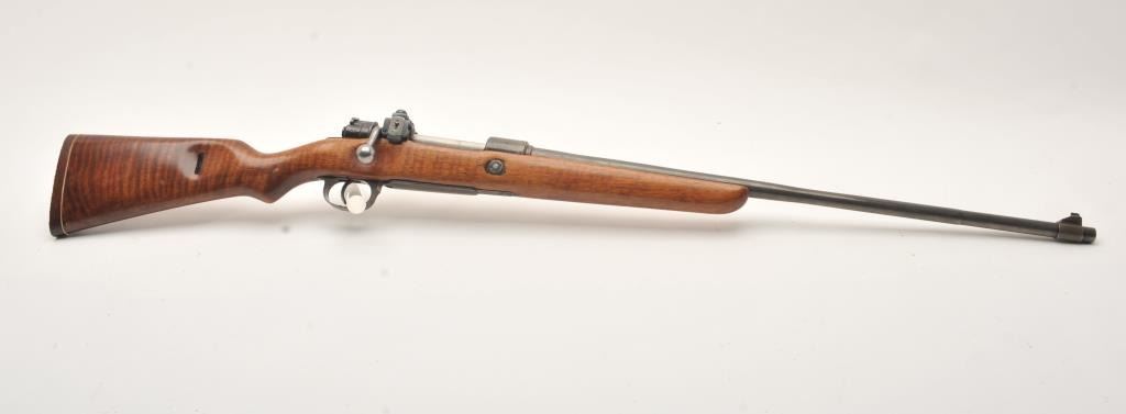 Sporterized Model 98 bolt action rifle, top of receiver is stamped “CE/43”, nazi proofed, 8mm Mauser caliber, 24” barrel, Lyman adjustable receiver mounted rear sight, wood half stock, S/N 4483; overall good fair to good condition as modified; grey patina to metal surfaces, good bore, crisp action, nicely grained wood sporting stock. (C&R). Est.: $125-$250.