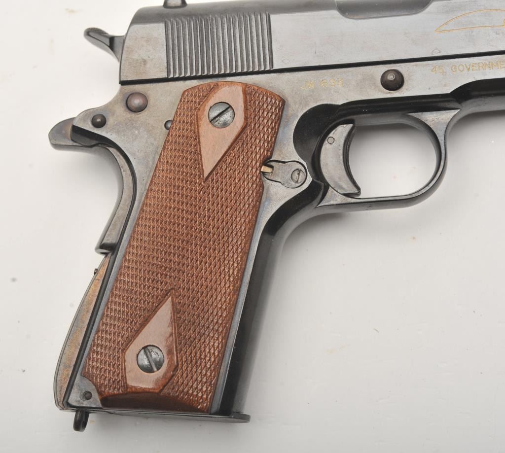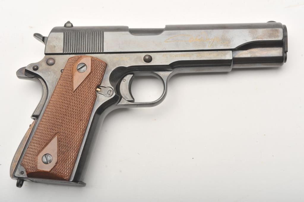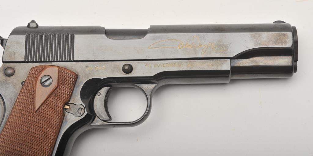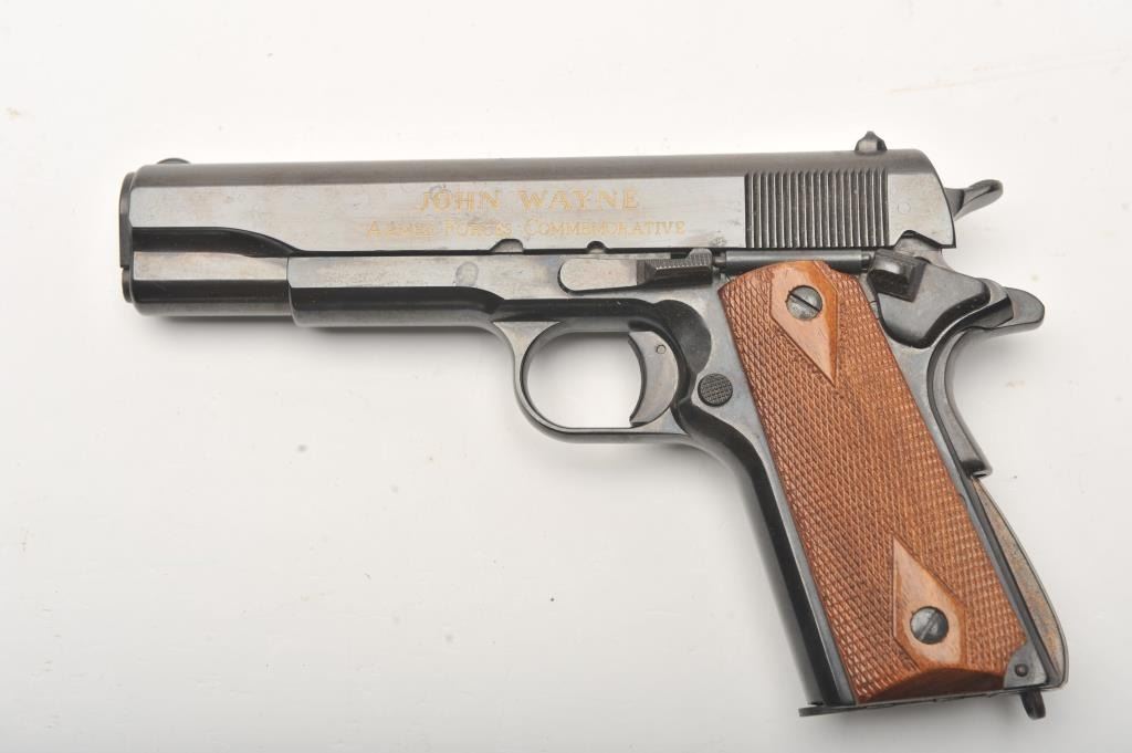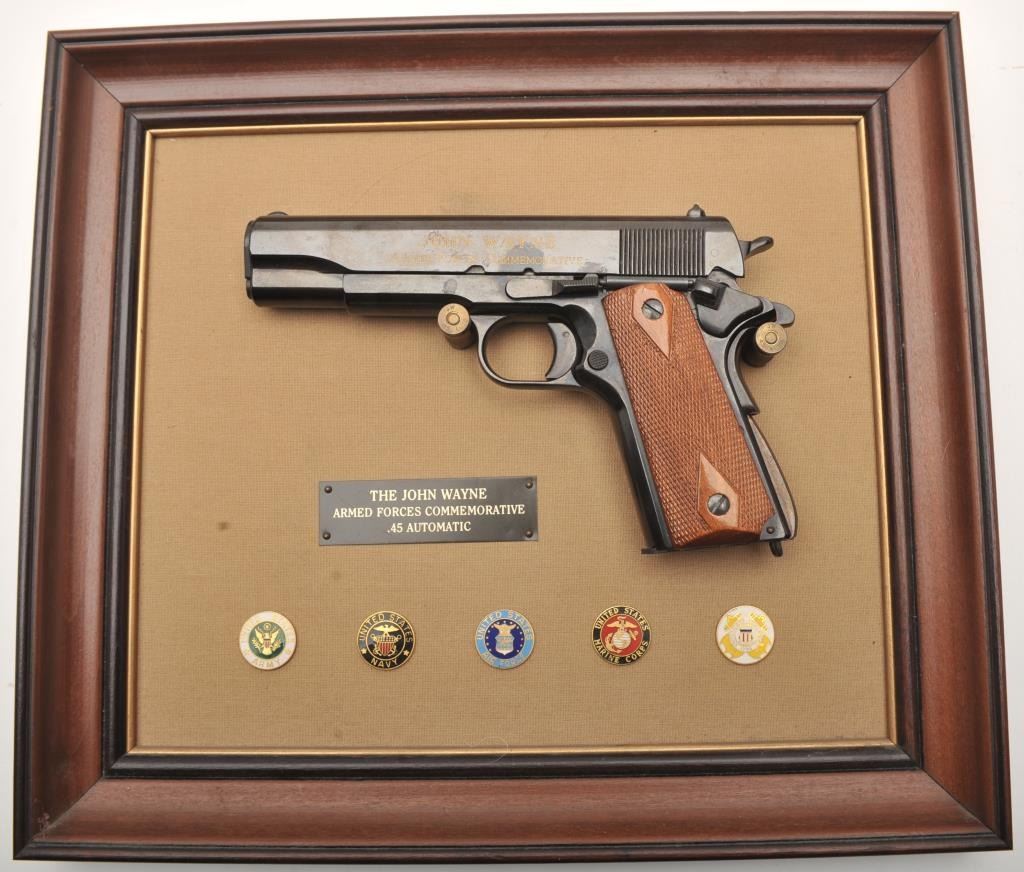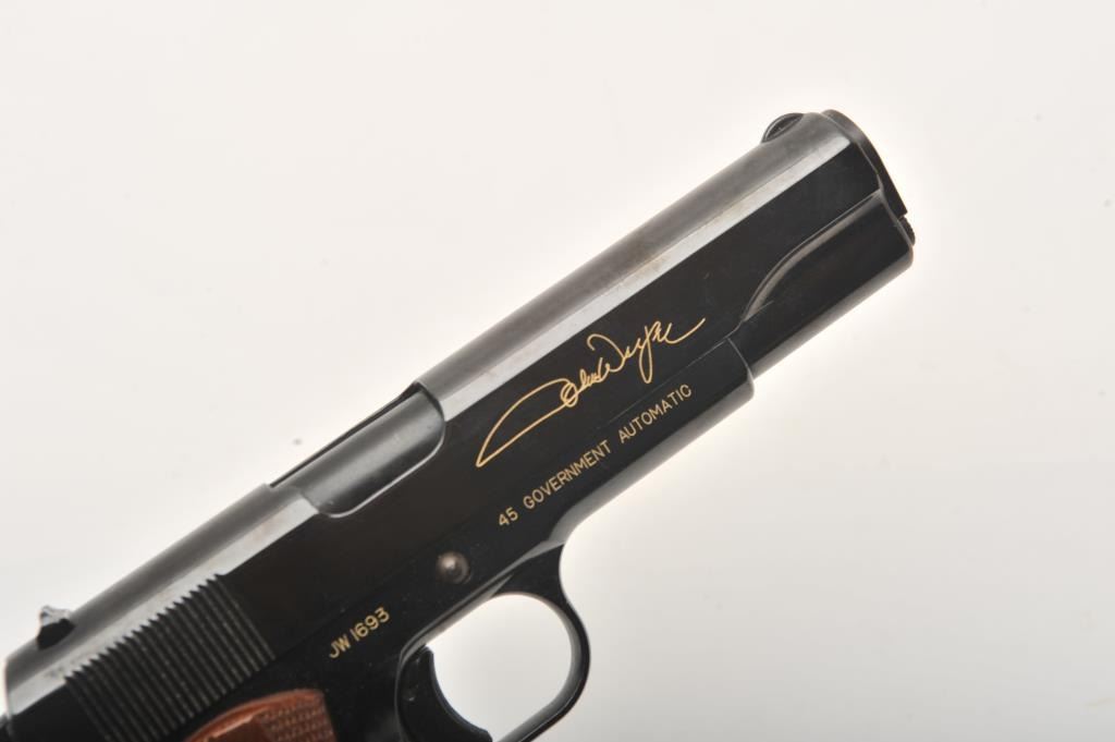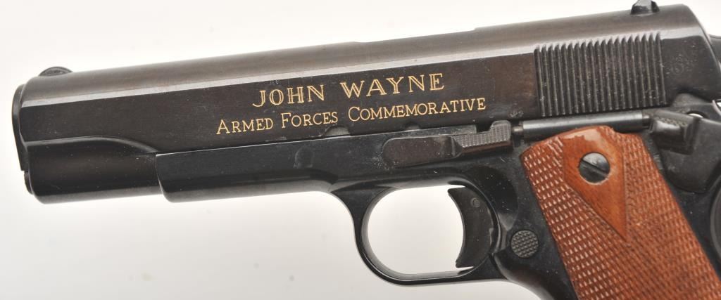 Franklin Mint non-functioning replica 1911-A1 non-gun John Wayne Armed Forces Commemorative with inscribed John Wayne signature on right side of slide, S/N JW 1693; overall fine condition with framed wall plaque and Franklin Mint paperwork. (non-gun). Est.: $100-$200.