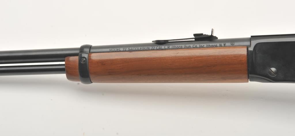 Ithaca Model 72 lever action Saddle Gun, 22LR caliber, 18.5” barrel, blued finish, wood stocks, S/N 72005350; overall very good to fine condition with fine bore, crisp action and markings, majority of original finish, very good + wood. (Modern). Est.: $125-$250.
