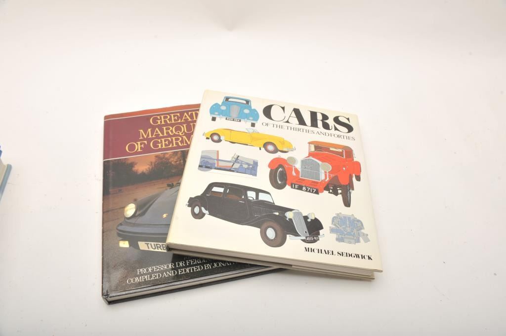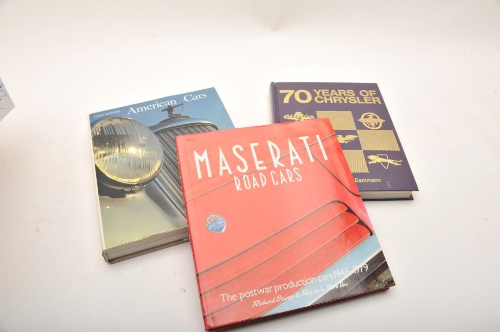 Lot of 9 car books, mostly hardbacks including “The American Car Since 1775”; “Relics of the Road”; “Cars of the Thirties and Forties”; “Great Marques of Germany”; “Maserati Road Cars”; “70 Years of Chrysler” and more! Est.: $100-$200.