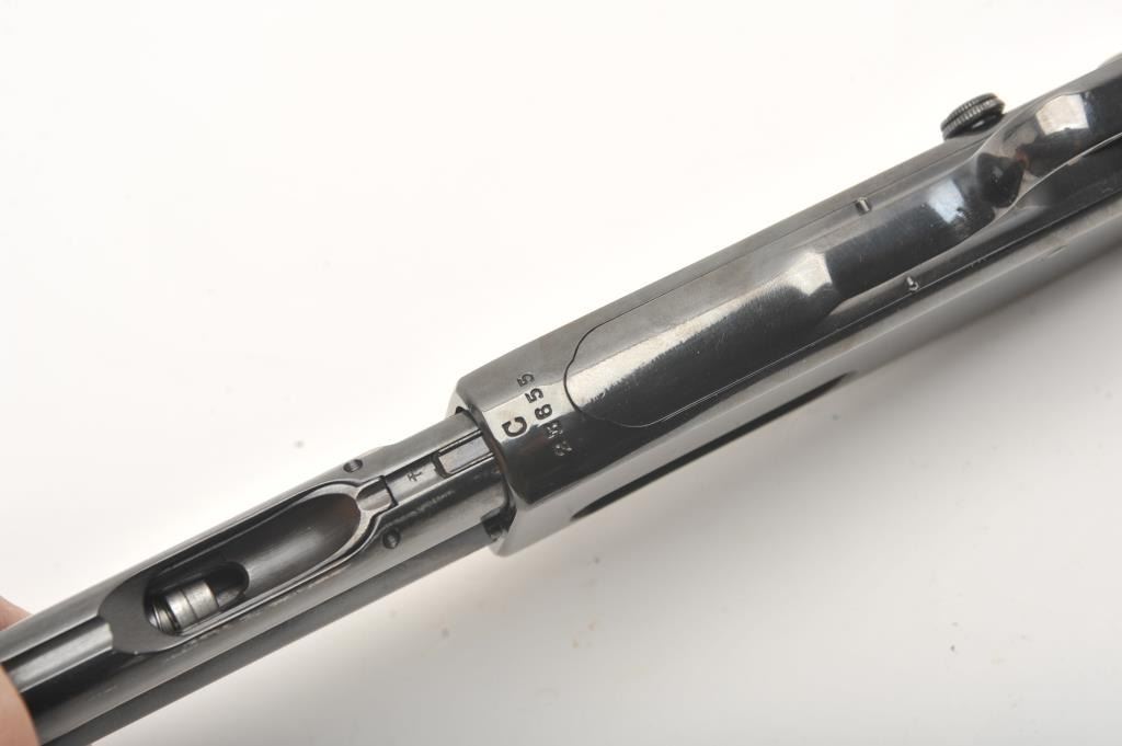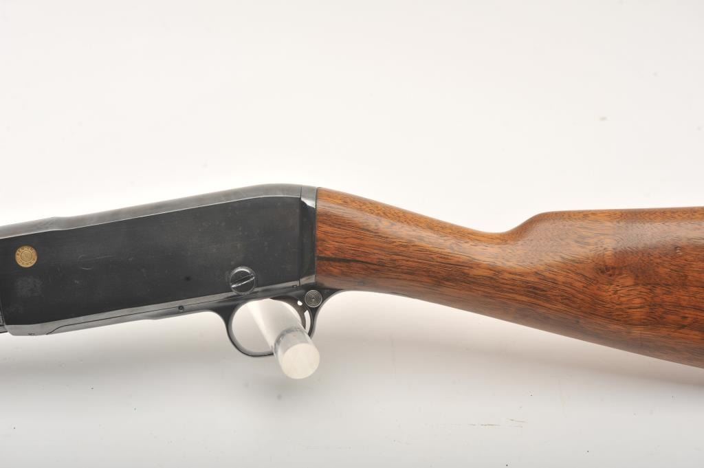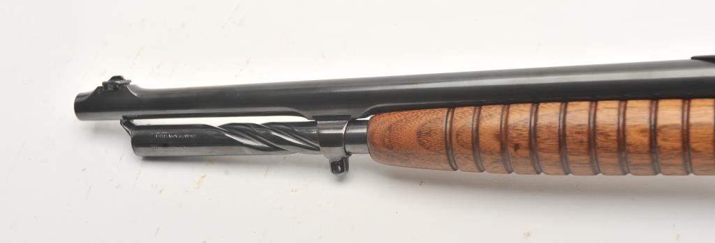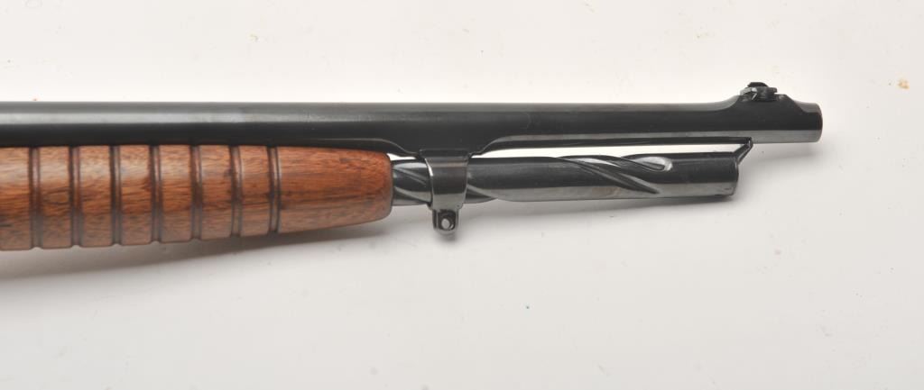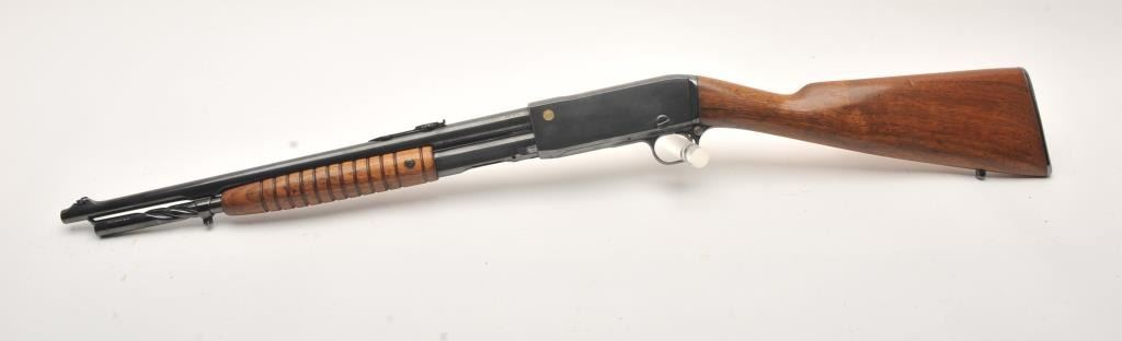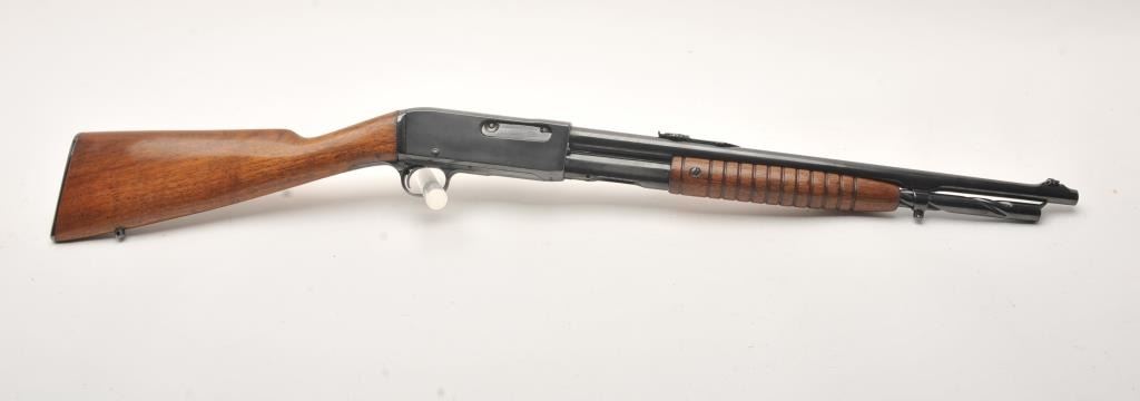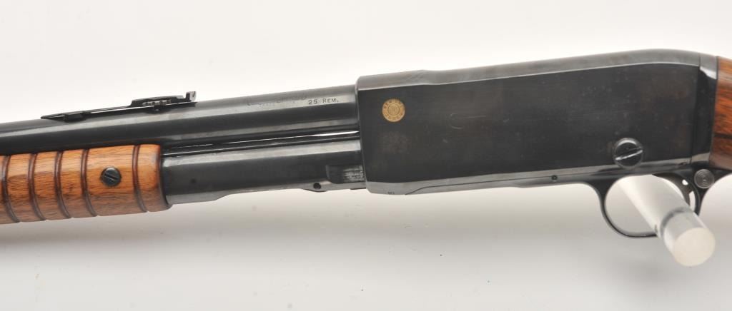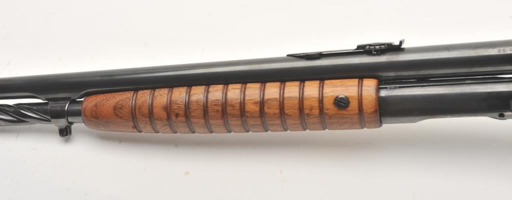 Remington Model 14R pump action carbine, .25 Rem. caliber, 18.5” barrel, rare “wheel” rear sight, old re-blued finish, wood stocks, S/N C23655; overall good condition with a good bore, crisp action, good markings and good wood stocks. (C&R/PPT). Est.: $400-$800.