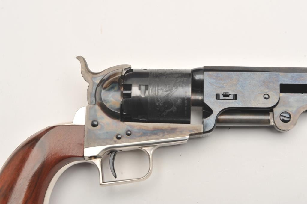 Colt New Blackpowder Model 1851 Navy percussion revolver, .36 caliber, 7.5” octagon barrel, blued and case hardened finish, wood grips, S/N 7667; like new condition and accompanied by a Colt factory wood presentation partitioned case with combination nipple wrench/screwdriver and cap container. (Percussion). Est.: $500-$1,000.
