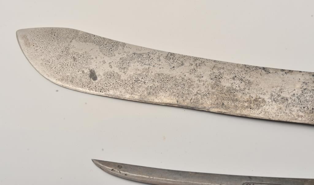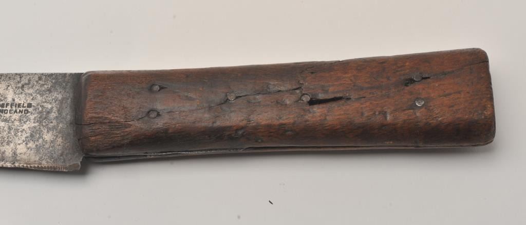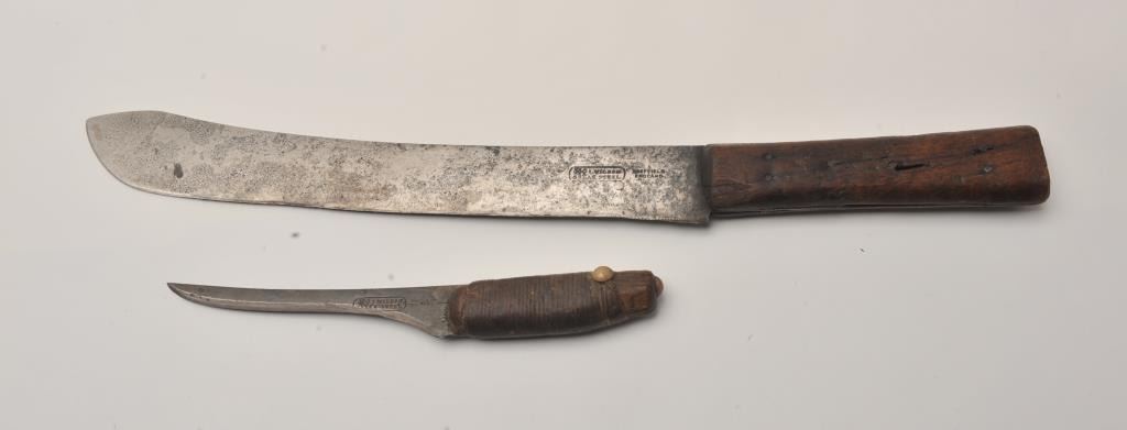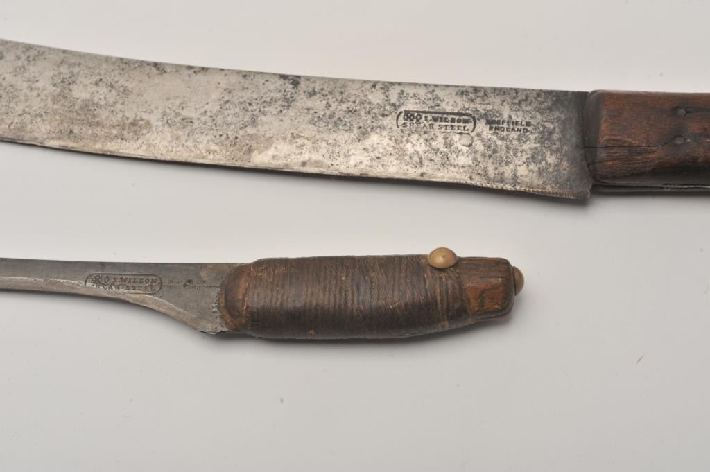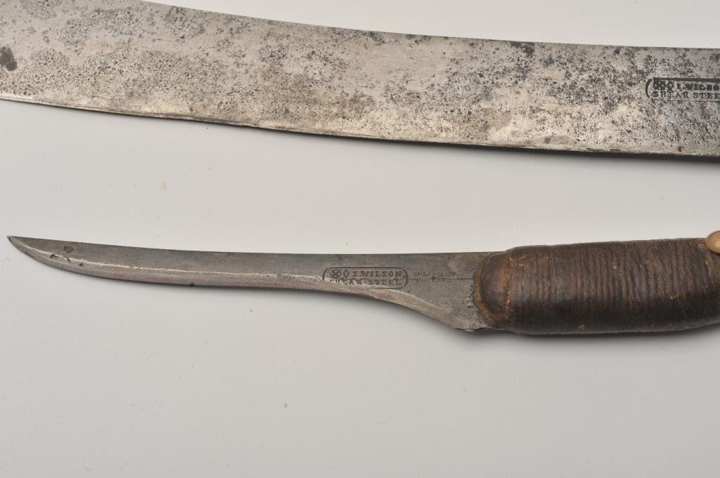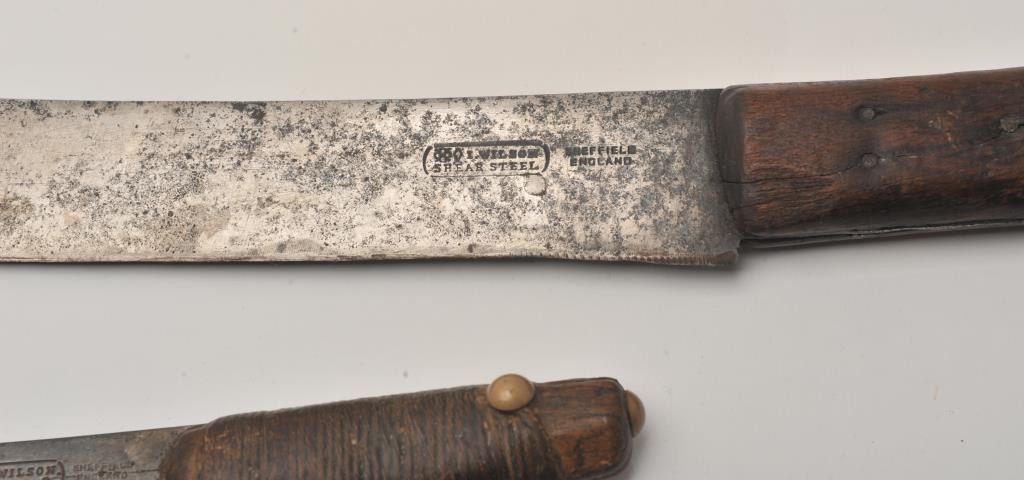 Two I. Wilson-marked steel butcher knives similar to those used on the American frontier by buffalo hunters; one is approximately 10” overall, well used with wrapped wood handle and brass tack; the other is a large knife, approximately 20” overall with a 6 steel pinned wood grip. Est.: $75-$150.