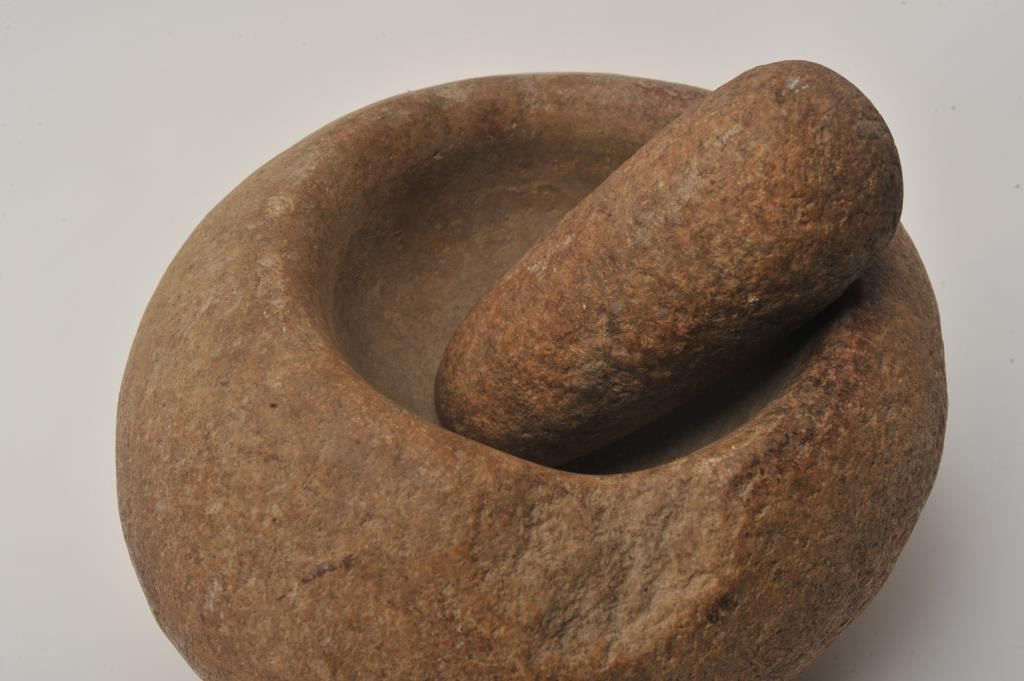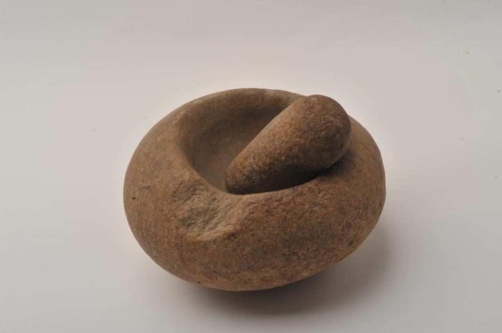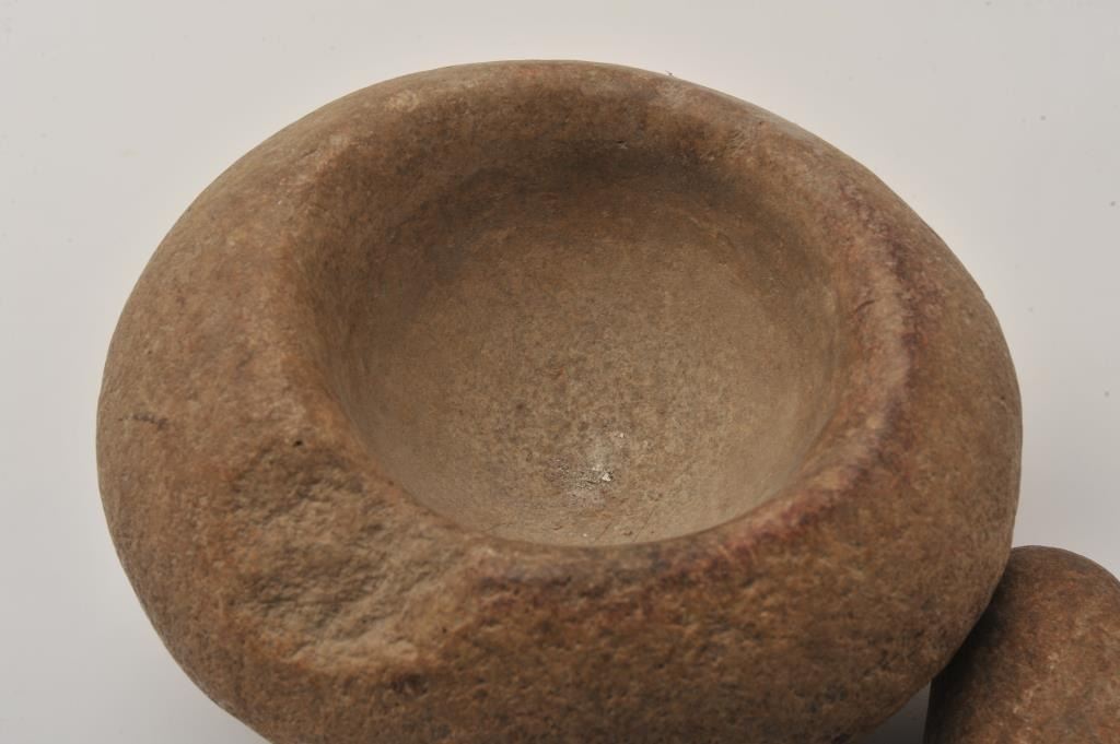 Old American Indian stone metate bowl and pestle found in Arizona; bowl is approximately 9” in diameter and 6” in height. Est.: $75-$125.