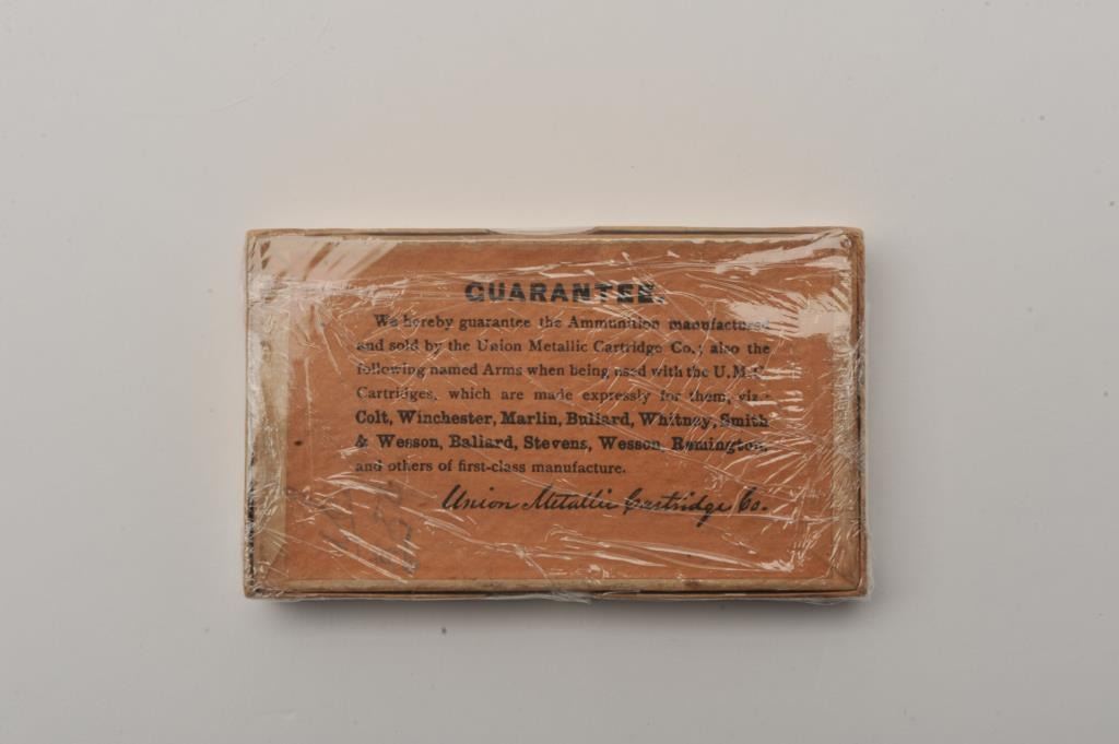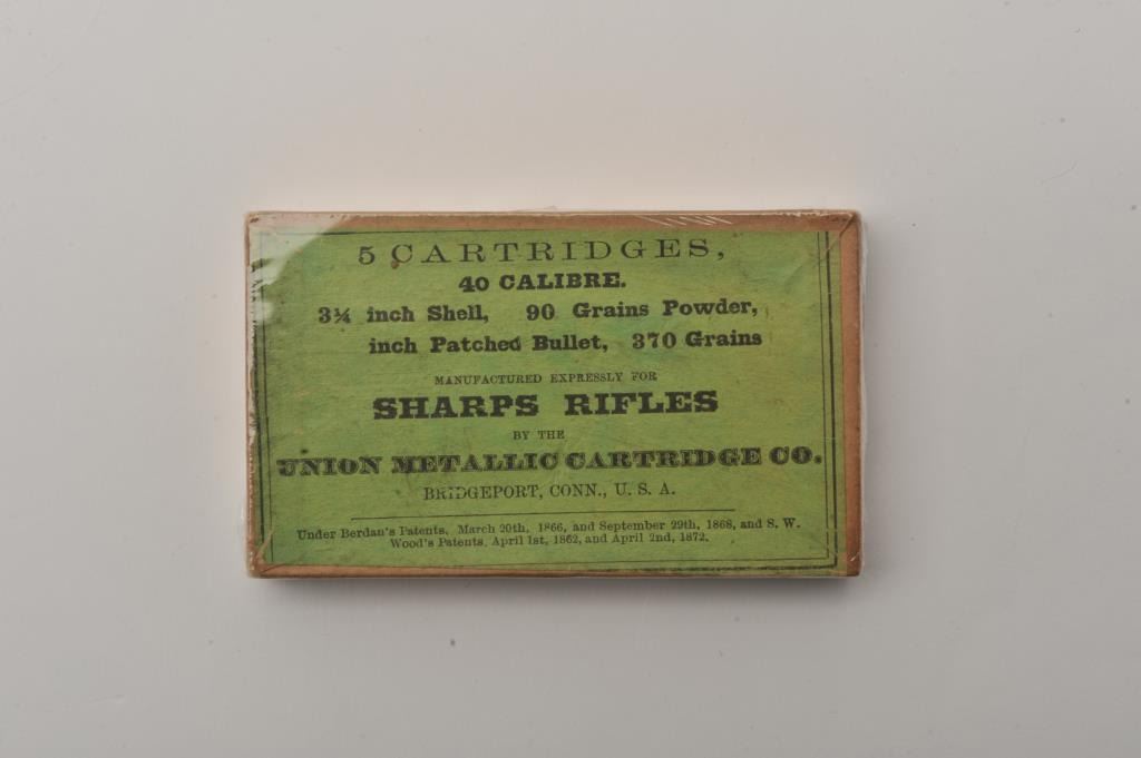 Box of UMC Co.-made .40-90-370 caliber cartridges (5 rounds) for Sharps rifles with green label. Est.: $100-$175.