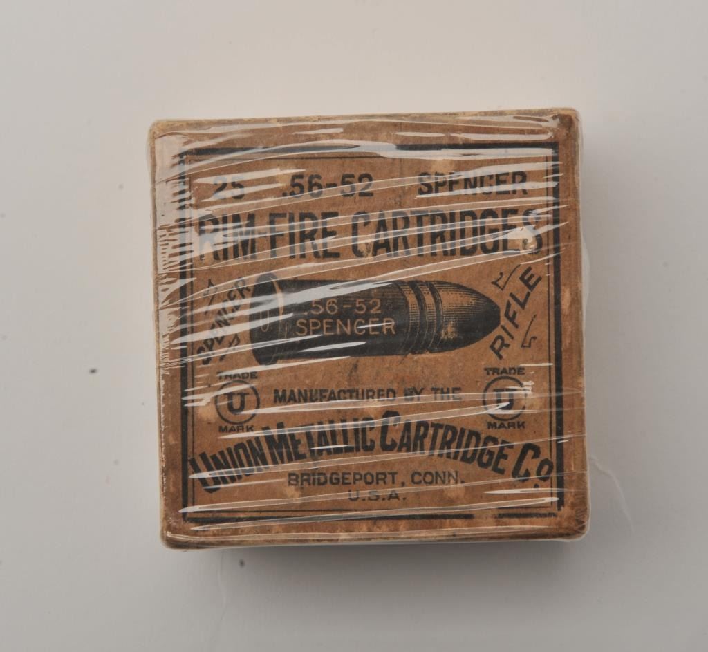 Scarce box of 25 .56-52 rim fire caliber cartridges for the Spencer rifle by UMC Co. with white and orange labels. Est.: $150-$250.