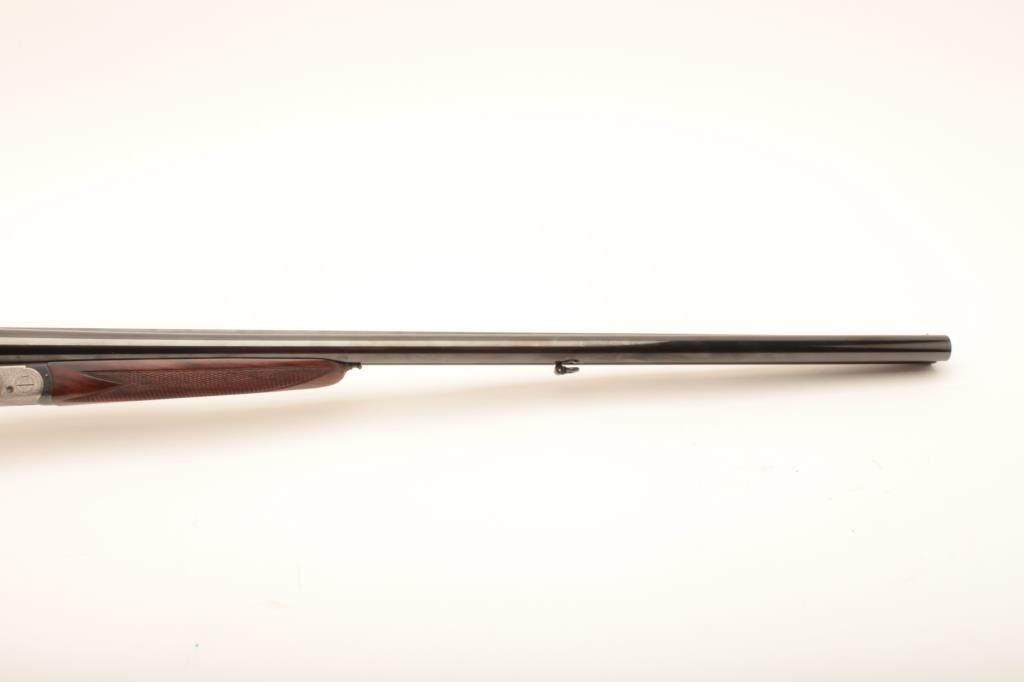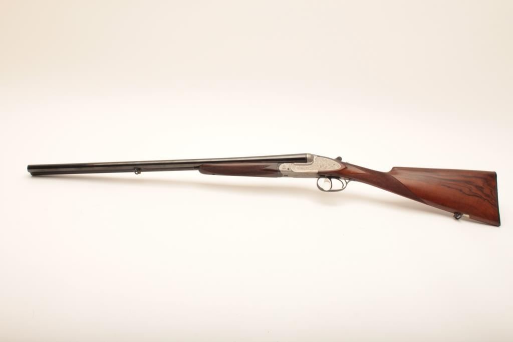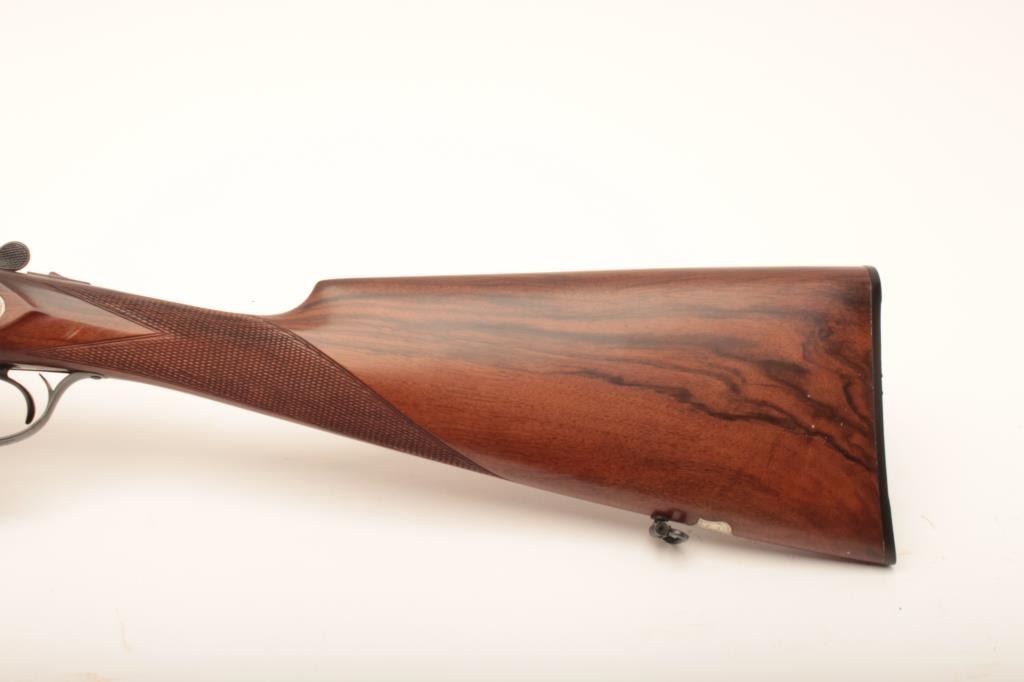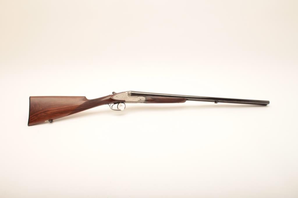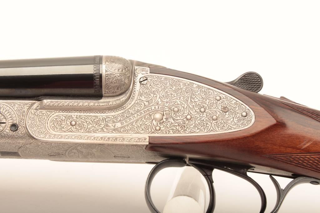 V. Bernadelli High Grade 20GA SxS shotgun with 25 ½” barrels, double triggers, low rise non-vent rib, auto ejectors, straight stock, and scroll and game scene engraved, S/N 199002. Measures 15 ¼” to the end of factory plate. European style swivels. Minor storage light rust on the frame otherwise very good plus. Needs T.L.C. and cleaning. Leg of mutton case included. (C&R) Est.: $1400-$2800