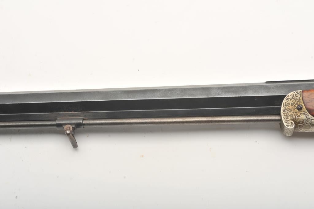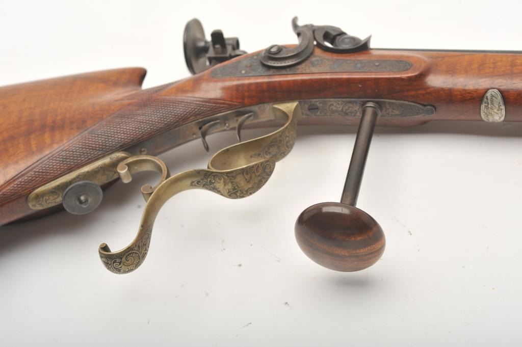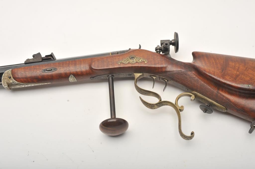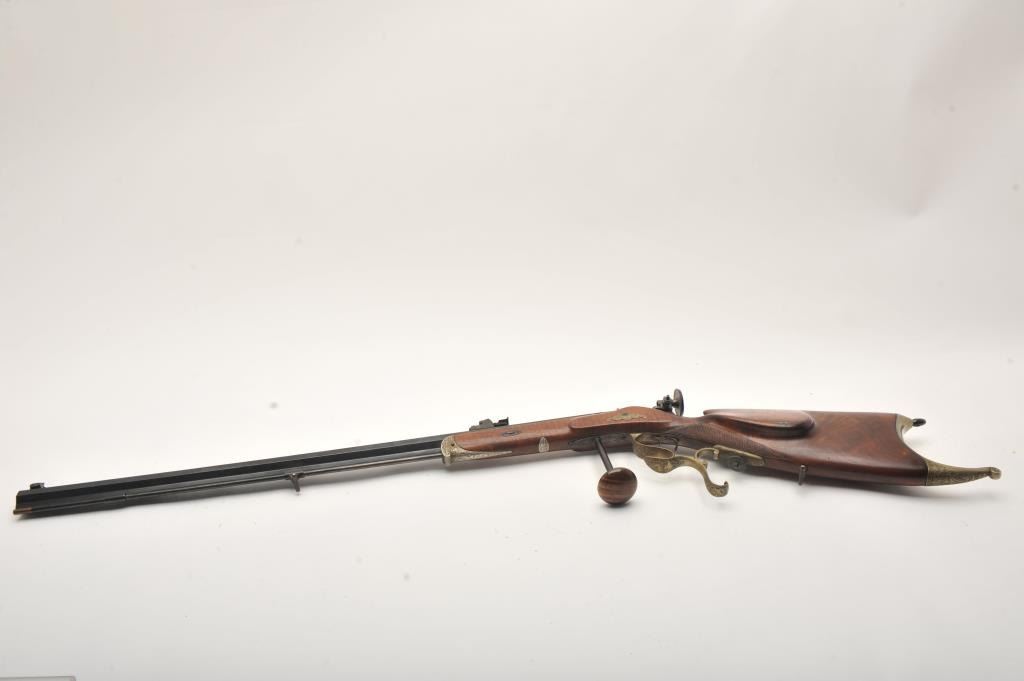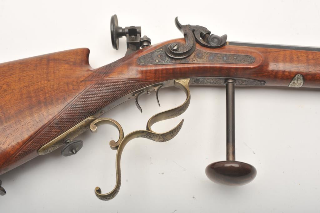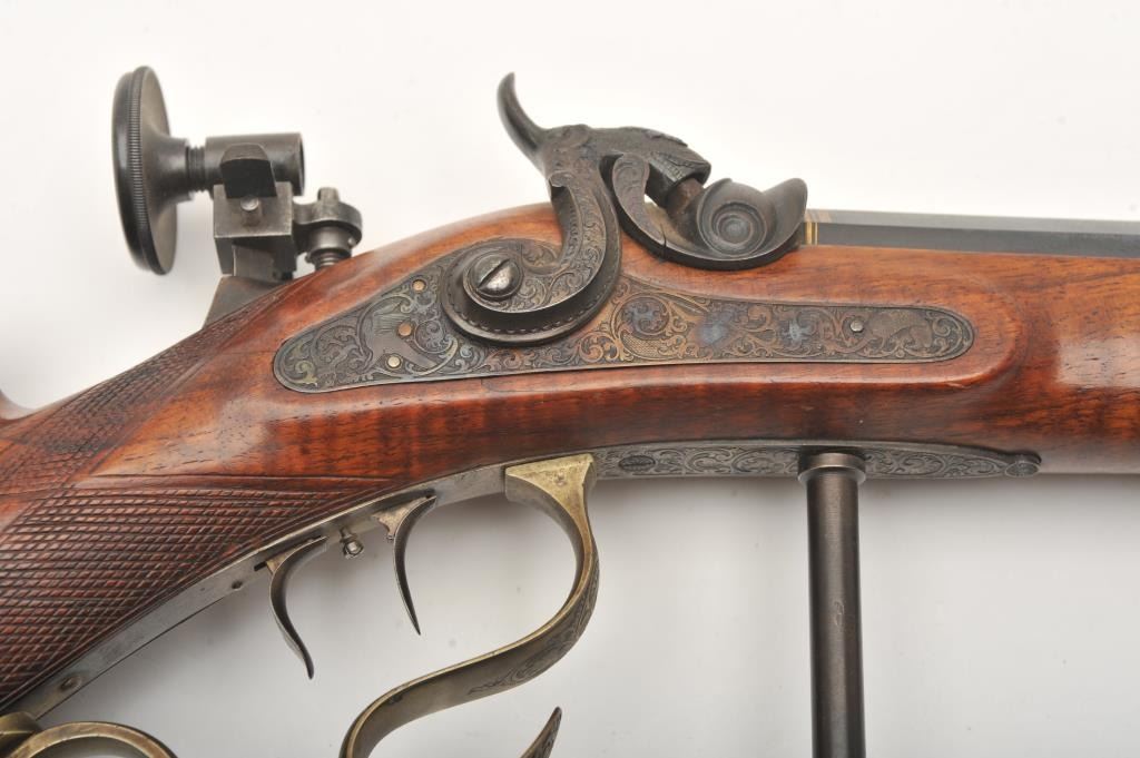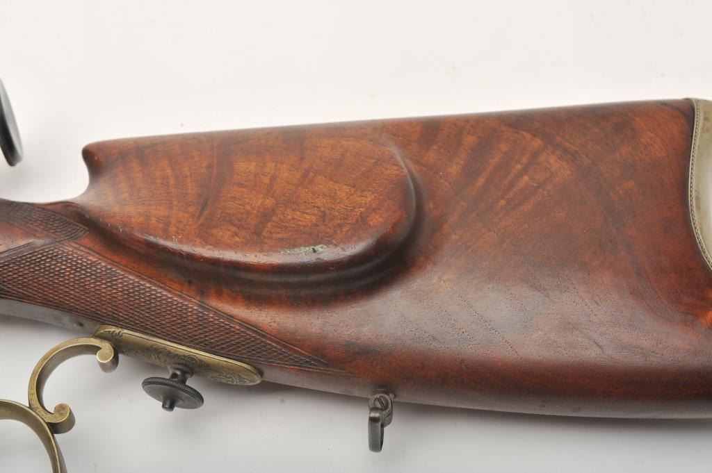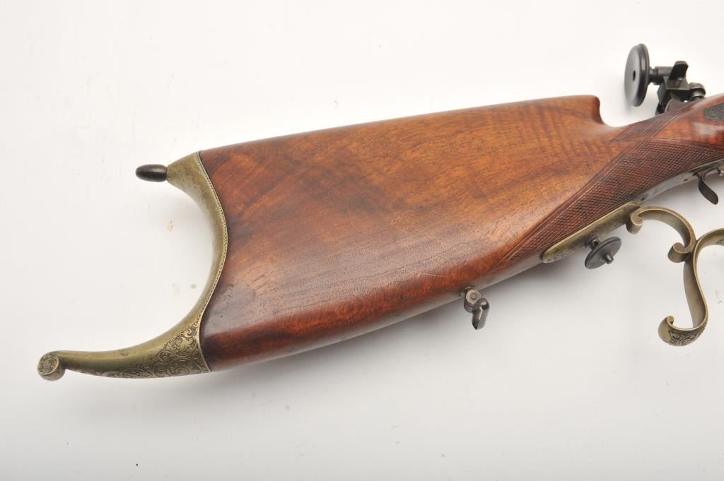 High Quality German Percussion “Shutzen” target rifle signed in gold “A. Hoffman in Margdeburg”. Measures approximately 46 ½” overall with a 30” heavy octagon barrel in .32 caliber rifled. Fancy engraving on the lock mounts and rear sight. Double set triggers. Gold bands at the breech. Shows old European quality refinish with very good stock. Palm rest and ram rod included, Adjustable rear sight, tang peep and target front sights. Would clean nicely and needs a little T.L.C. A quality target arm featured in 1952 article about Dr. Cairns collection. (Antique) Est.: $1400-$2800