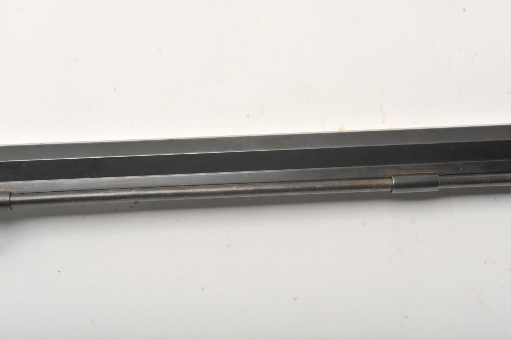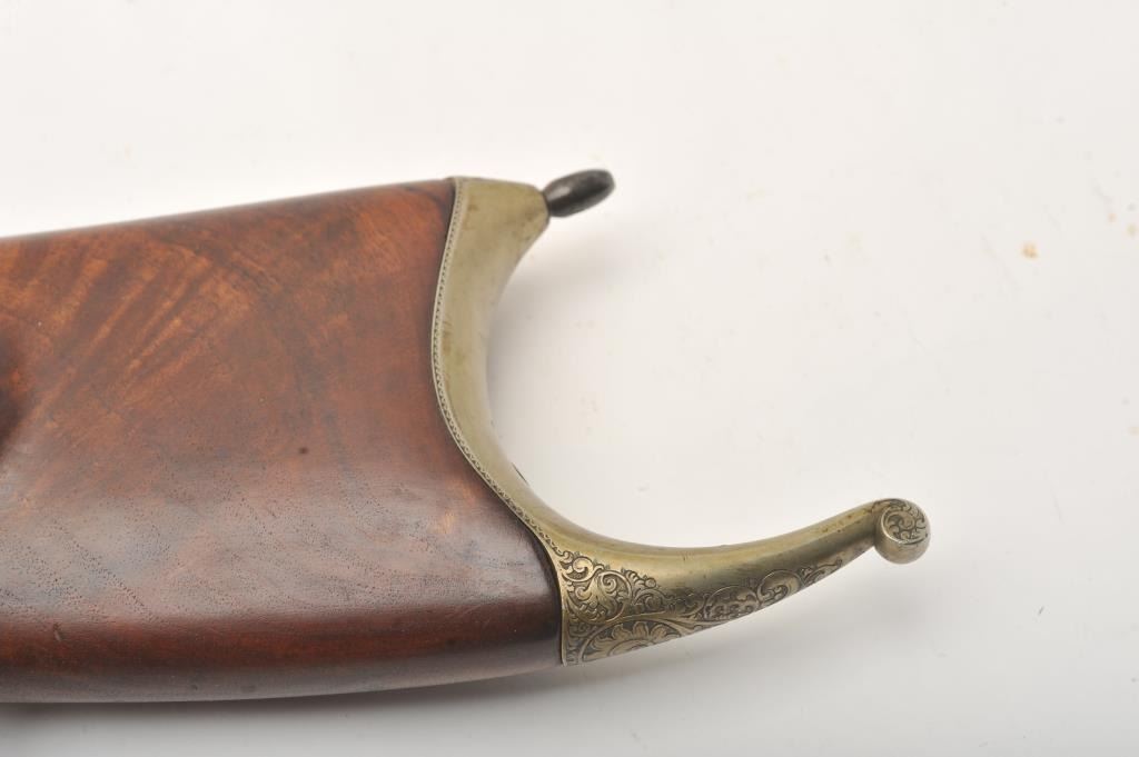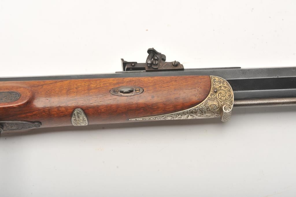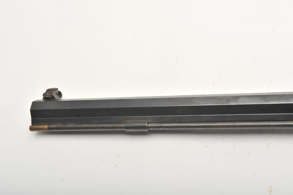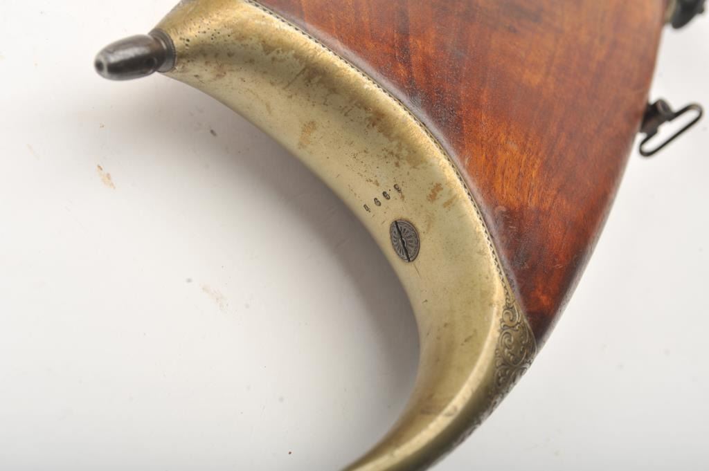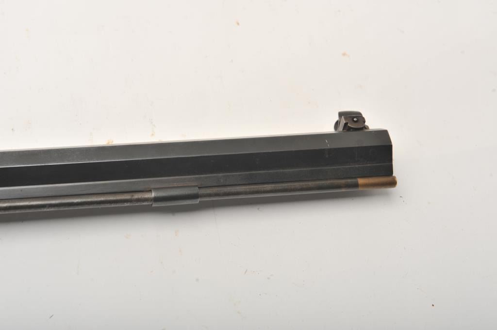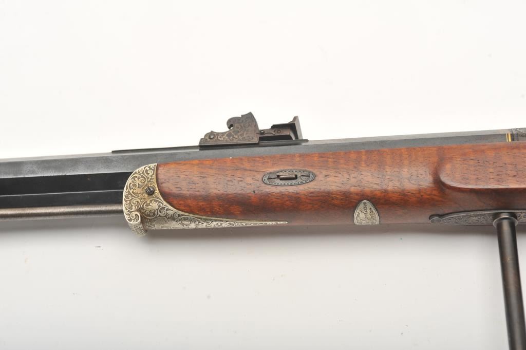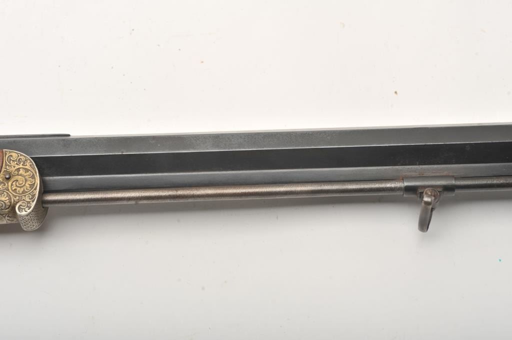 High Quality German Percussion “Shutzen” target rifle signed in gold “A. Hoffman in Margdeburg”. Measures approximately 46 ½” overall with a 30” heavy octagon barrel in .32 caliber rifled. Fancy engraving on the lock mounts and rear sight. Double set triggers. Gold bands at the breech. Shows old European quality refinish with very good stock. Palm rest and ram rod included, Adjustable rear sight, tang peep and target front sights. Would clean nicely and needs a little T.L.C. A quality target arm featured in 1952 article about Dr. Cairns collection. (Antique) Est.: $1400-$2800