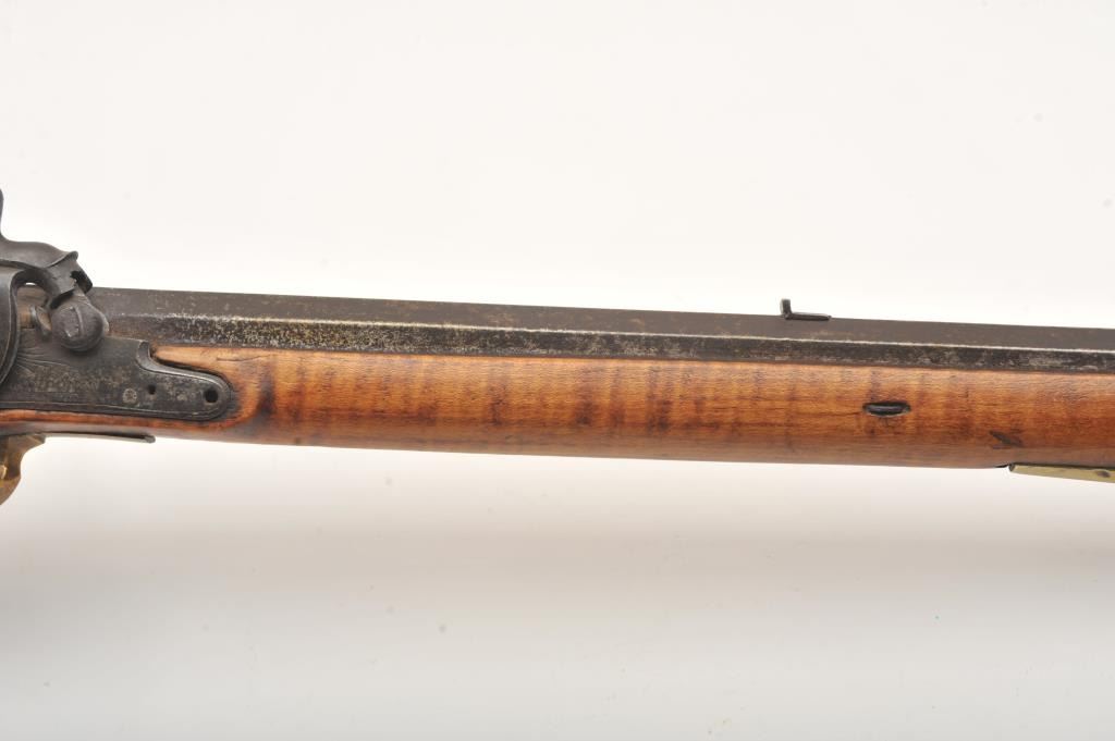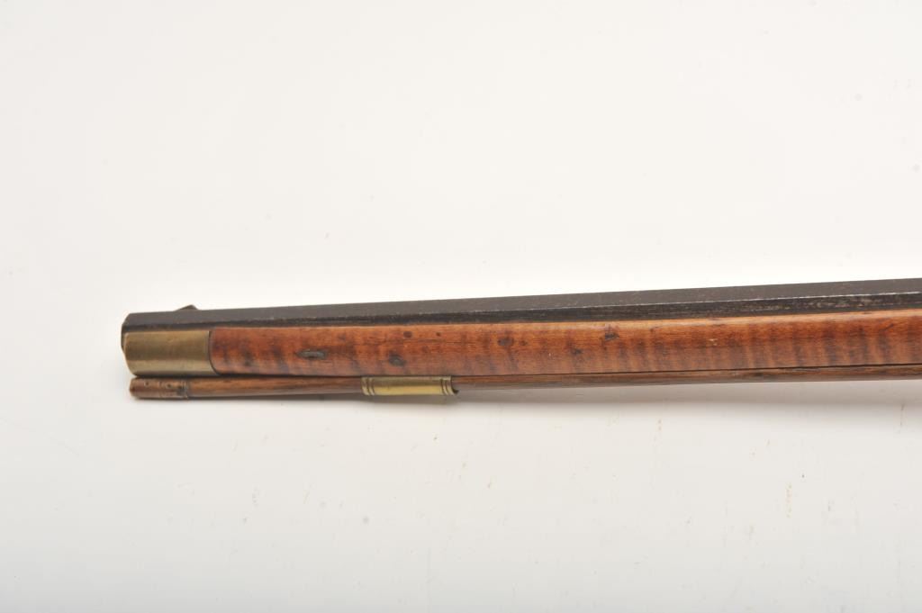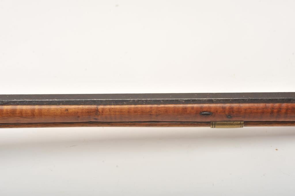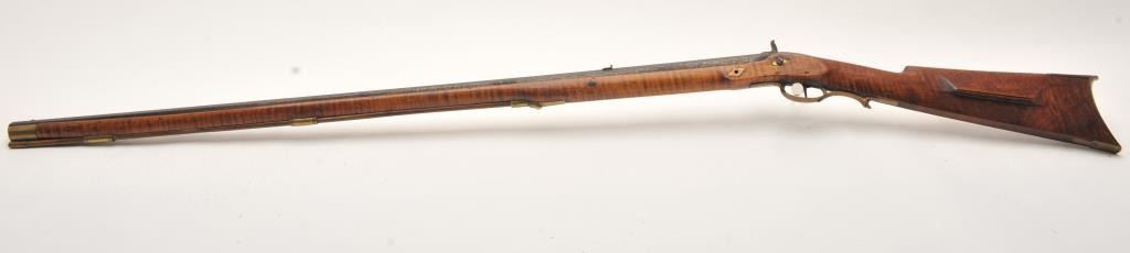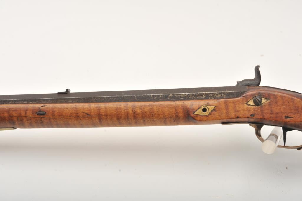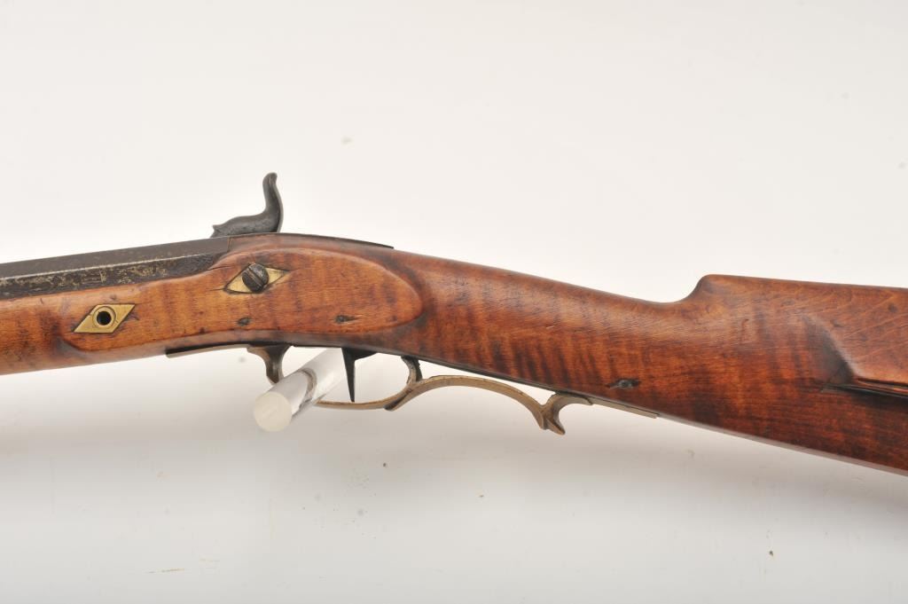 Full Stock unsigned Kentucky rifle with plain patchbox and London marked lock converted from flint to percussion. Measures 56” overall with a 39” barrel of approximately .38 caliber rifled. The stock is light color with natural stripping and good condition with minor wear and aging. Period or authentic ramrod. Lock not working and missing one lock screw. Dr. Cairns collection in storage for decades. (Antique) Est.: $400-$800