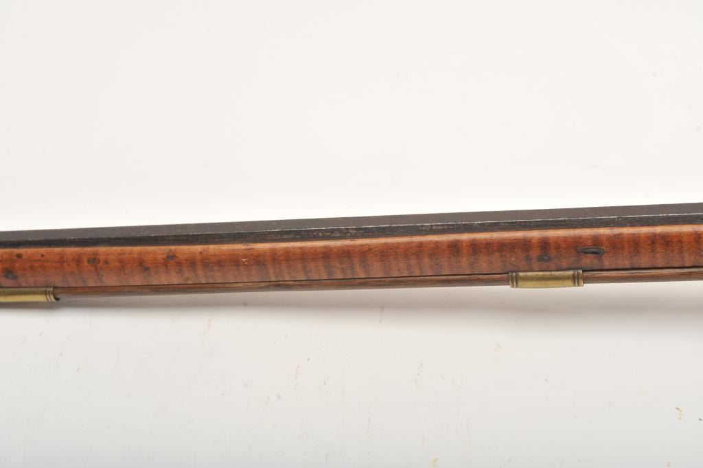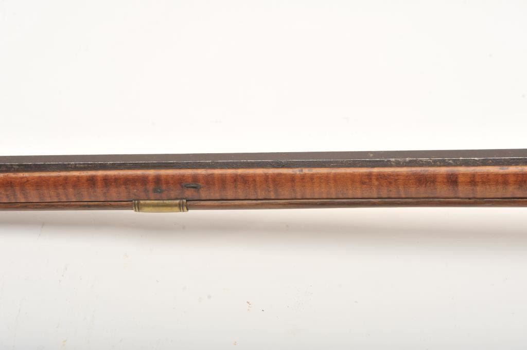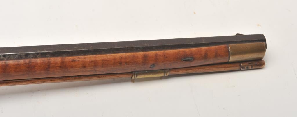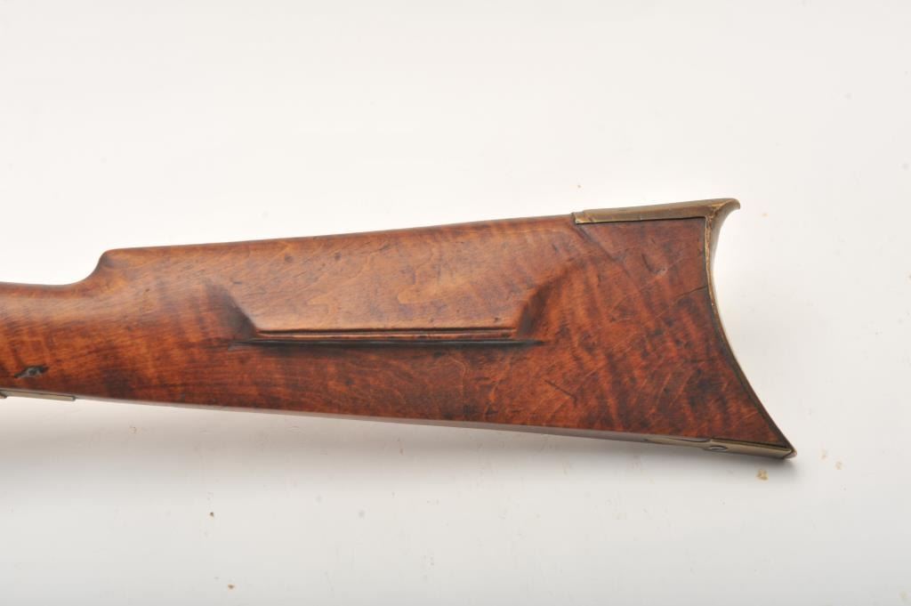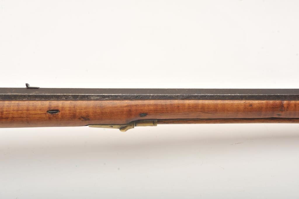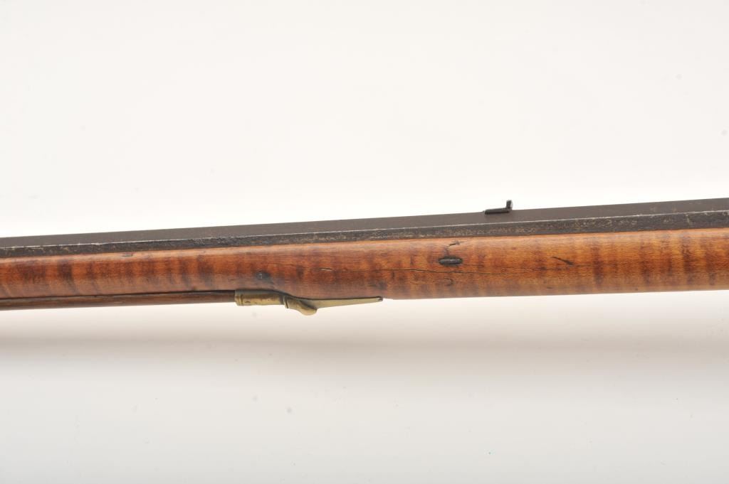Full Stock unsigned Kentucky rifle with plain patchbox and London marked lock converted from flint to percussion. Measures 56” overall with a 39” barrel of approximately .38 caliber rifled. The stock is light color with natural stripping and good condition with minor wear and aging. Period or authentic ramrod. Lock not working and missing one lock screw. Dr. Cairns collection in storage for decades. (Antique) Est.: $400-$800