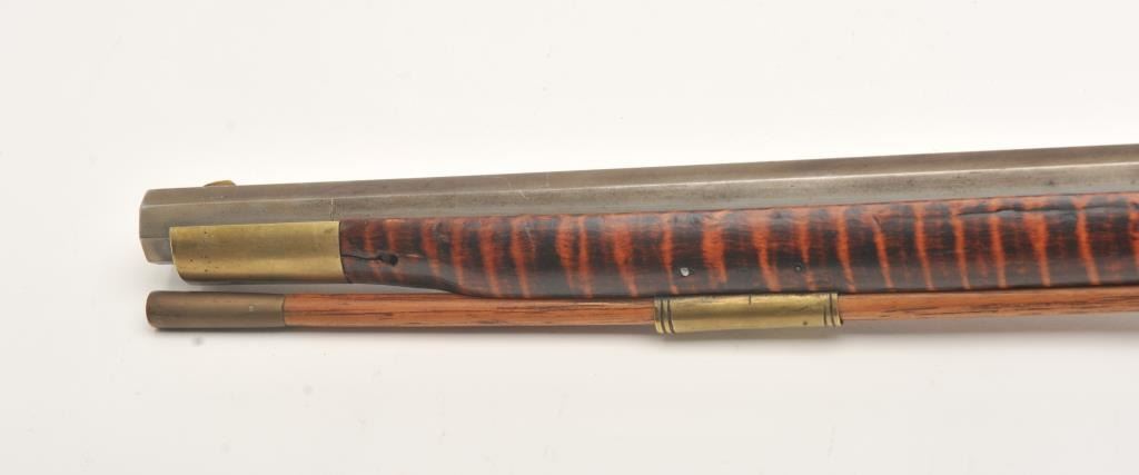 Full stock transition Kentucky in .56 caliber smoothbore for buckshot or ball. Unsigned and only marked “Warranted” on lock. False or “Burned Cord” stripping with leaf engraved mounts and square patchbox. A handmade gun that may combine 19th and 20th century elements. In storage for decades from Dr. Cairns collection. Attractive. (Antique) Est.: $500-$1000