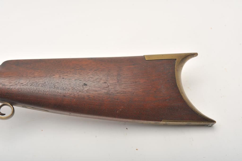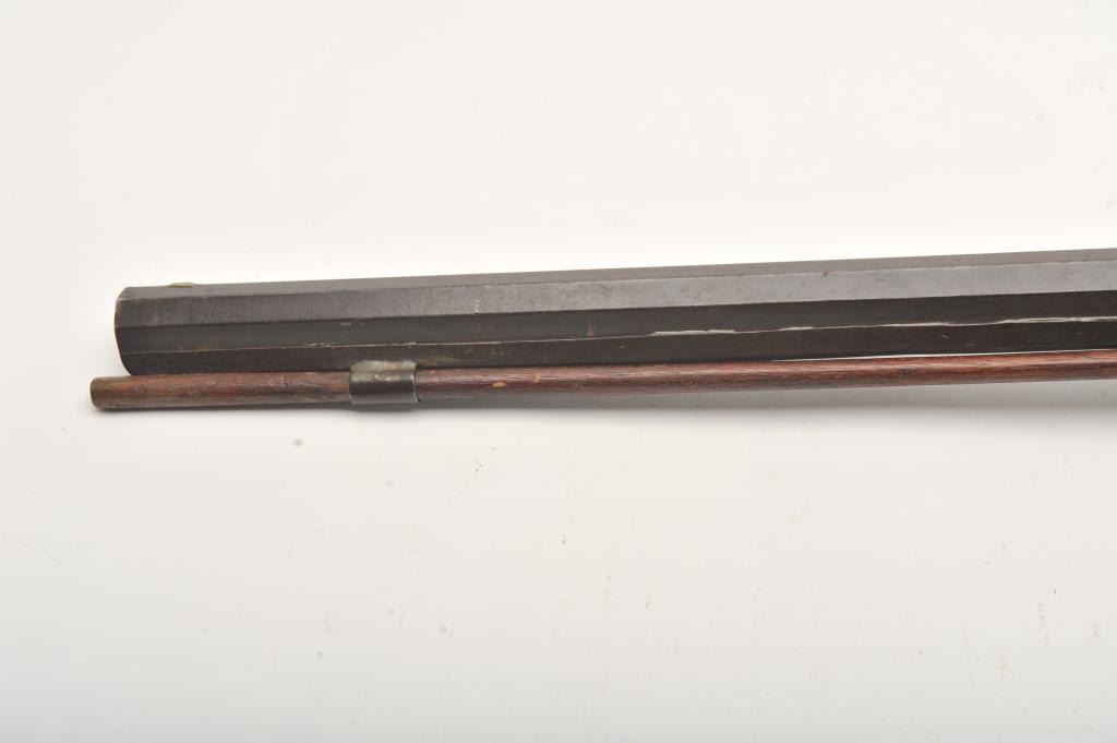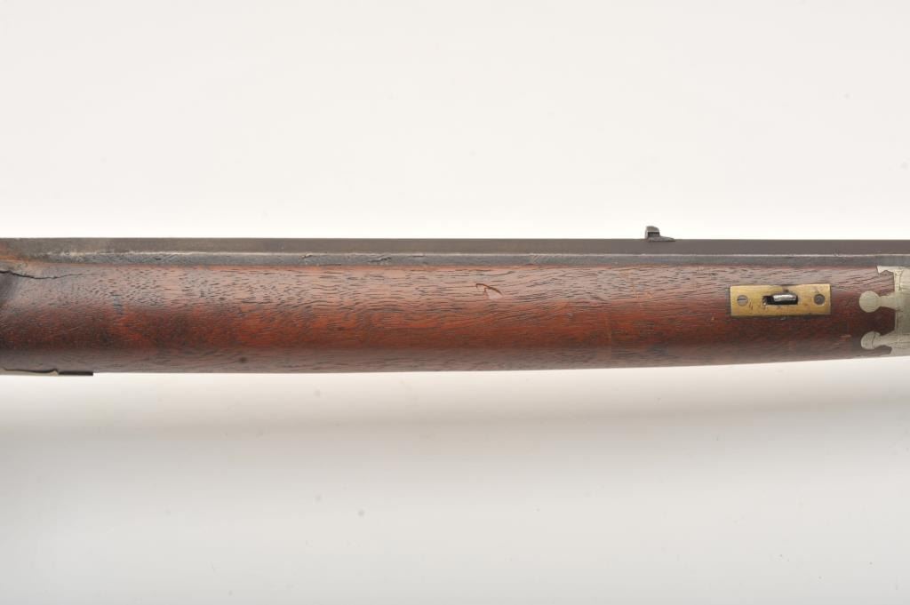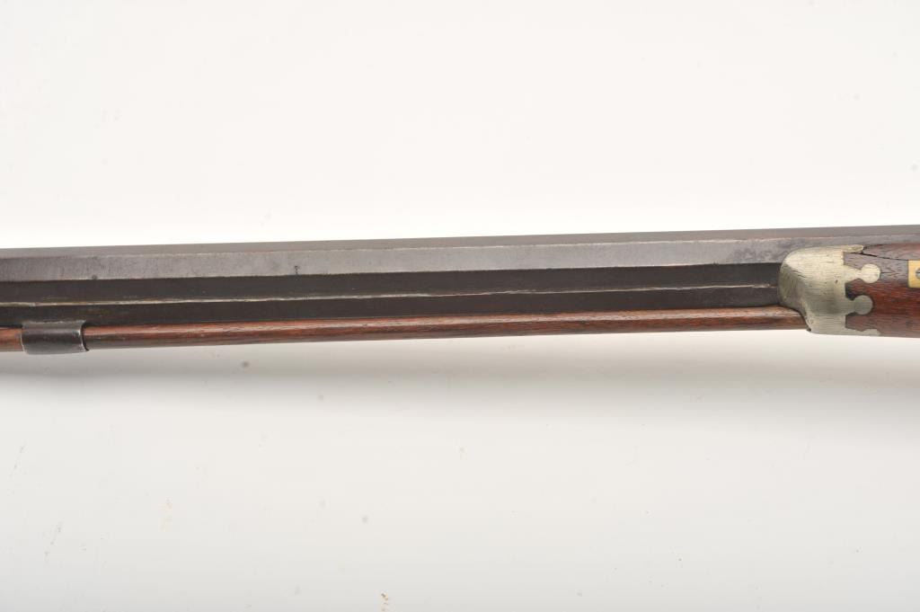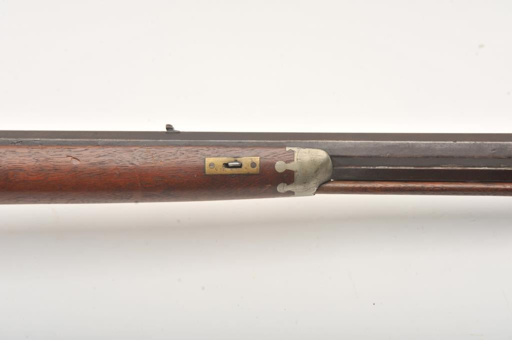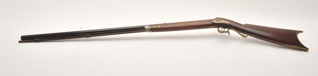 American Half Stocked Plains rifle with back action lock in .52 smoothbore for buckshot or ball. Single keyed barrel with fancy pewter fore end cap. Brass scroll guard with single trigger. Lock working. Good to very good overall condition with normal aging and circa 1850-70. Measures 52” overall with a 37” barrel. Dr. Cairns collection in storage for decades. (Antique) Est.: $200-$400