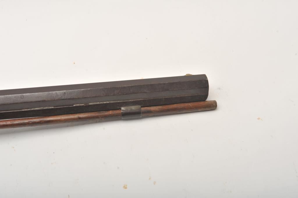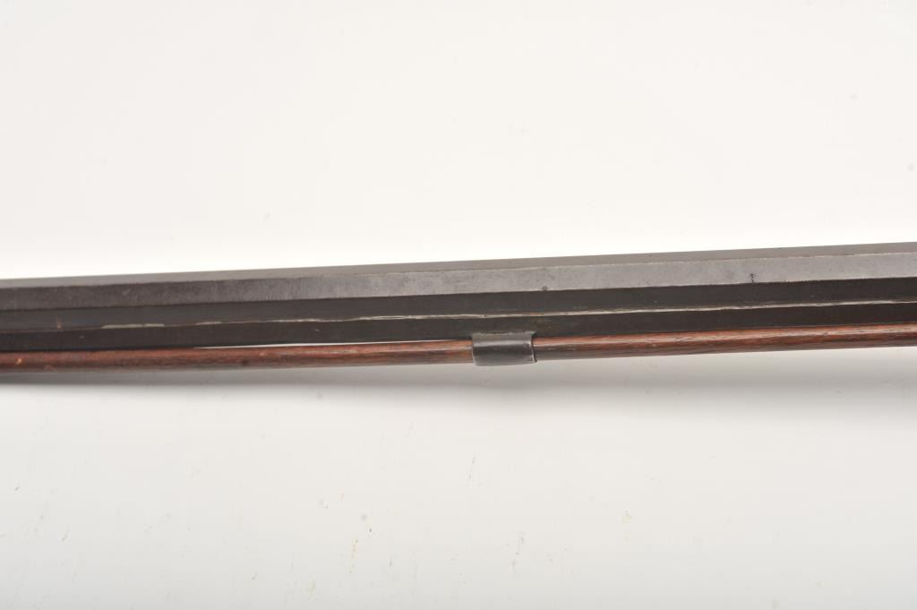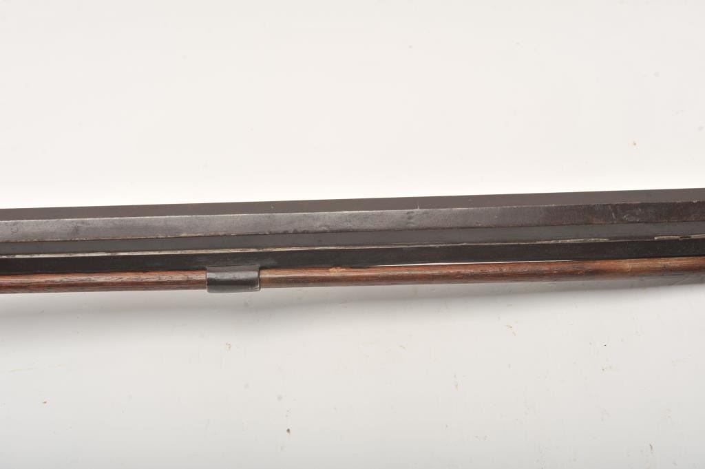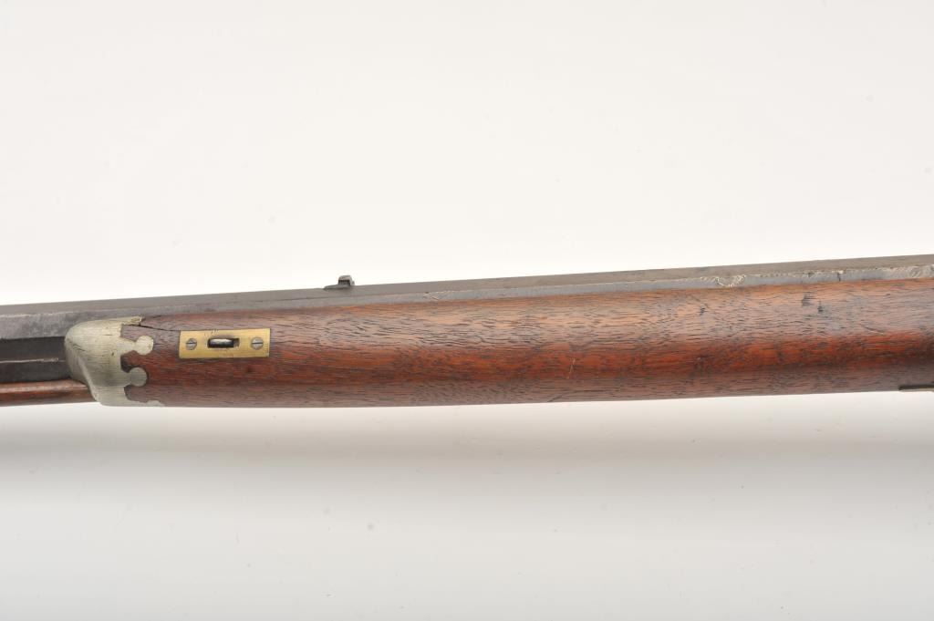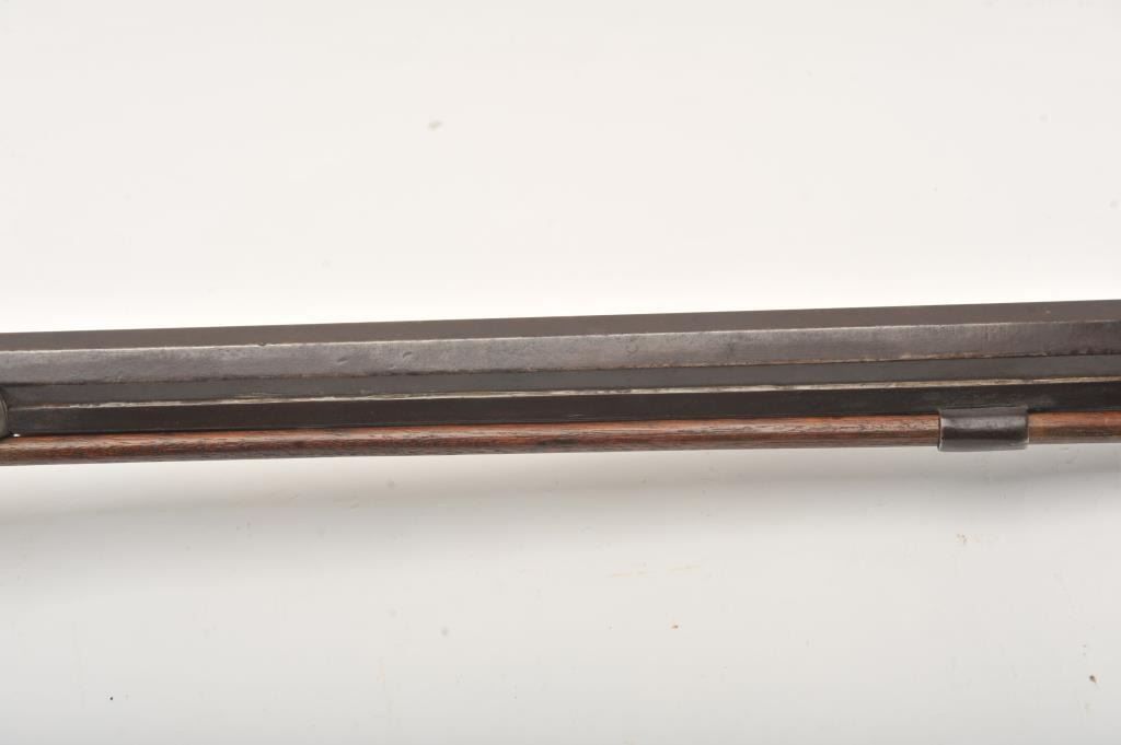 American Half Stocked Plains rifle with back action lock in .52 smoothbore for buckshot or ball. Single keyed barrel with fancy pewter fore end cap. Brass scroll guard with single trigger. Lock working. Good to very good overall condition with normal aging and circa 1850-70. Measures 52” overall with a 37” barrel. Dr. Cairns collection in storage for decades. (Antique) Est.: $200-$400