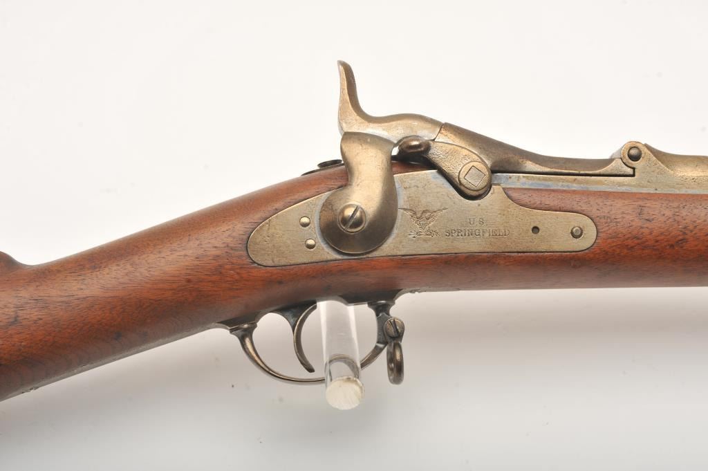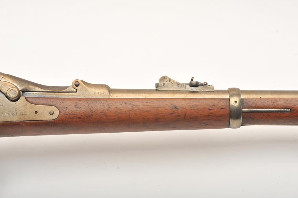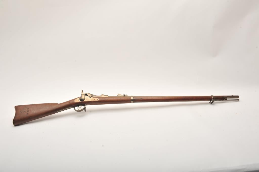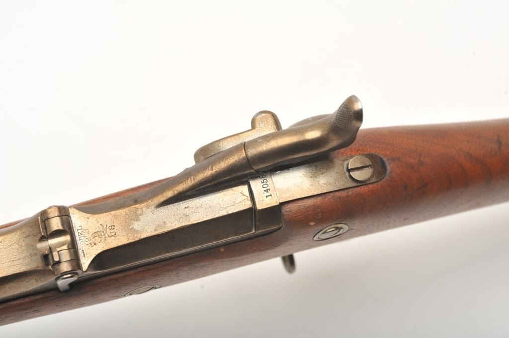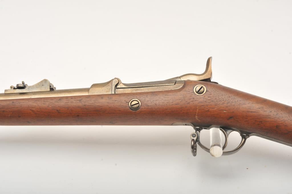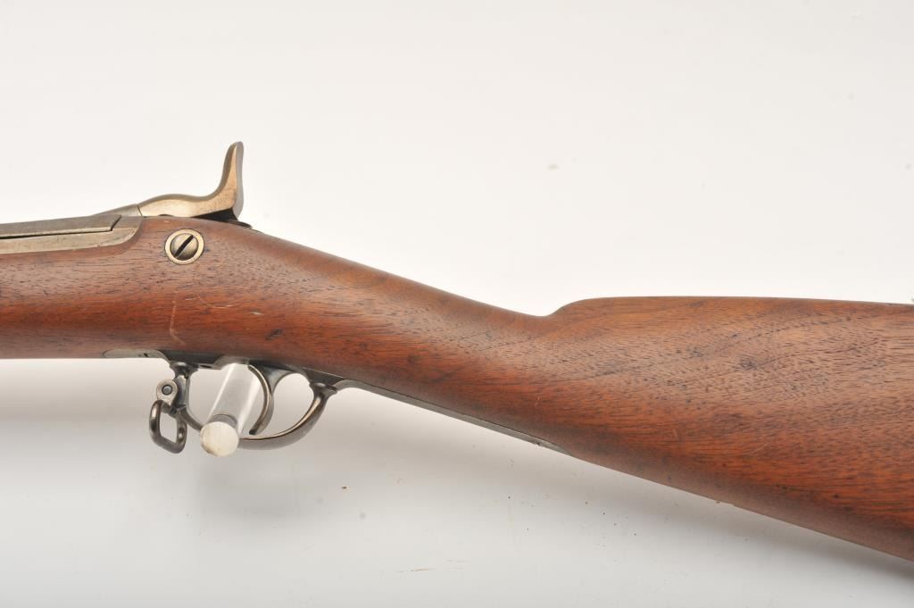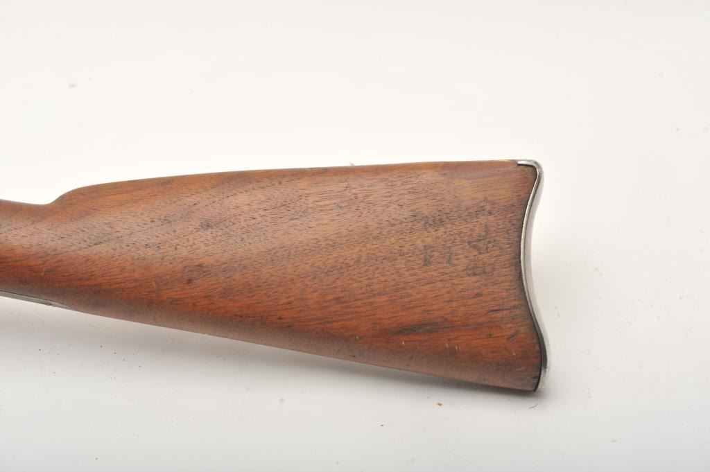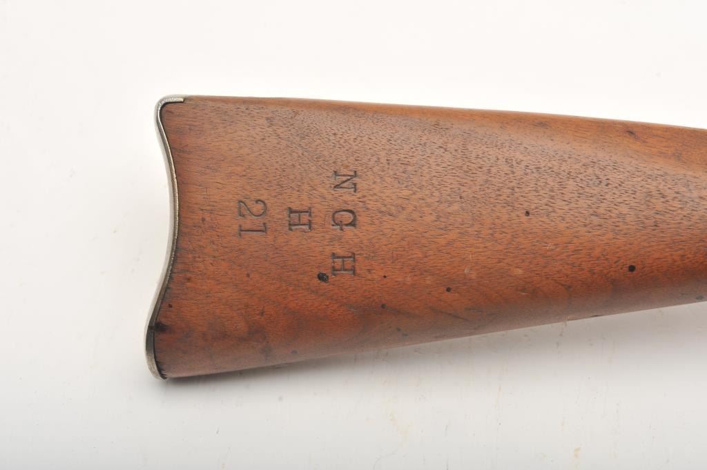 U.S. Model 1878 Trapdoor rifle in .45-70 caliber with standard configurations for this model, S/N 14058. The stock is stamped in block letters, “N.G.H. H 21”. Good overall with cleaned metal and wood stock. The bore is very dirty but will clean. Good markings. Cleaning rod retained. (Antique) Est.: $250-$500