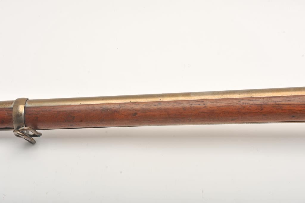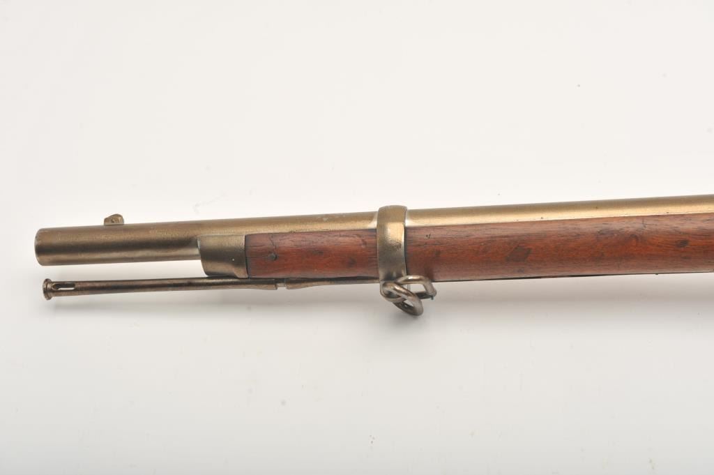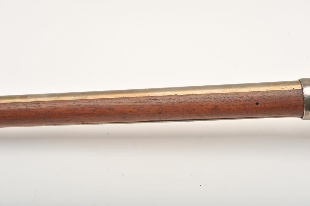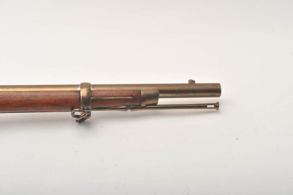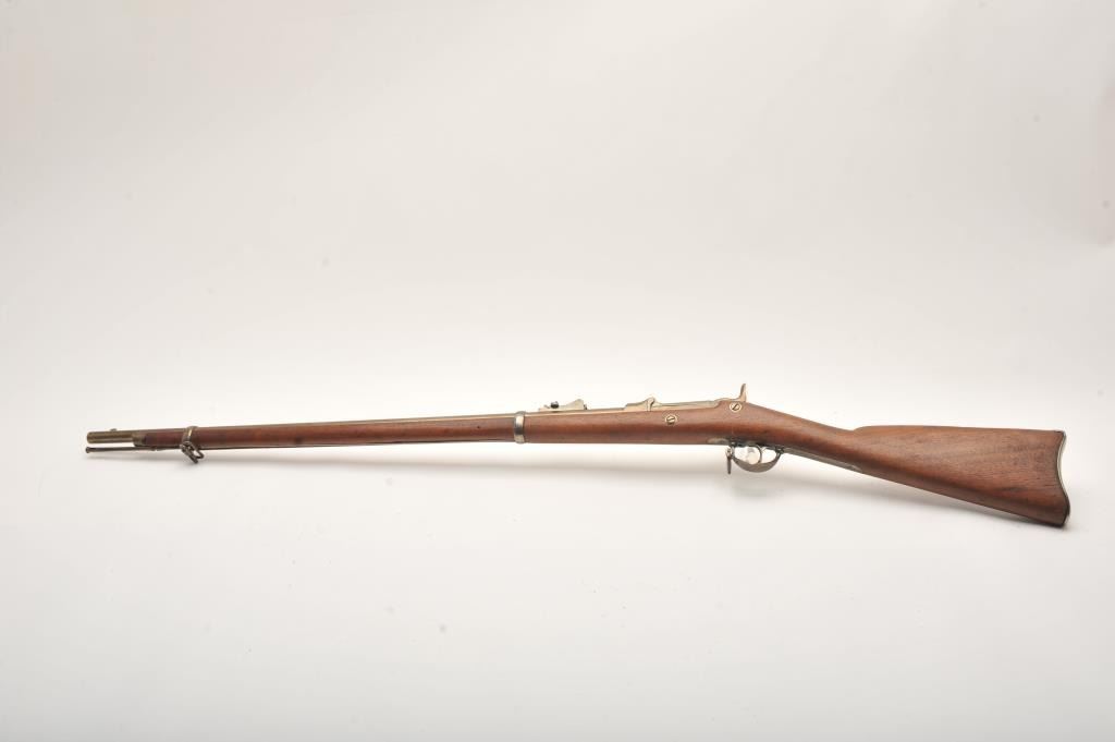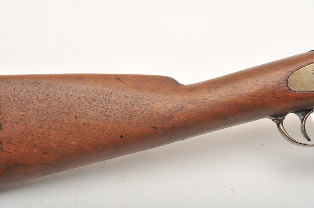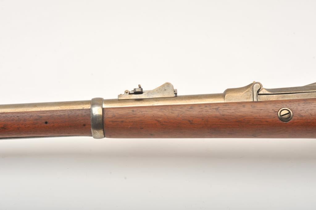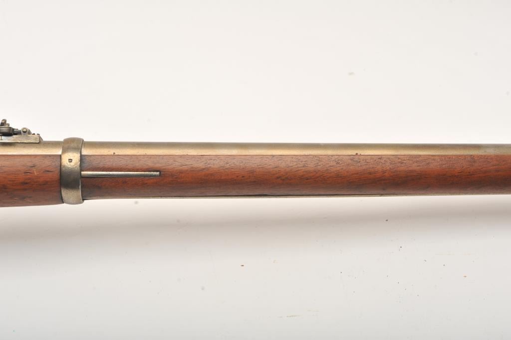 U.S. Model 1878 Trapdoor rifle in .45-70 caliber with standard configurations for this model, S/N 14058. The stock is stamped in block letters, “N.G.H. H 21”. Good overall with cleaned metal and wood stock. The bore is very dirty but will clean. Good markings. Cleaning rod retained. (Antique) Est.: $250-$500