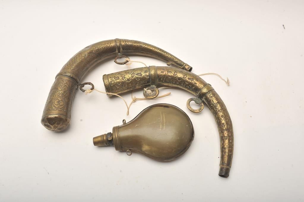 Lot consisting of shaped horn shotgun flask with spring charger probably French early 19th century and two brass 19th century powder flasks. Est.: $150-$300