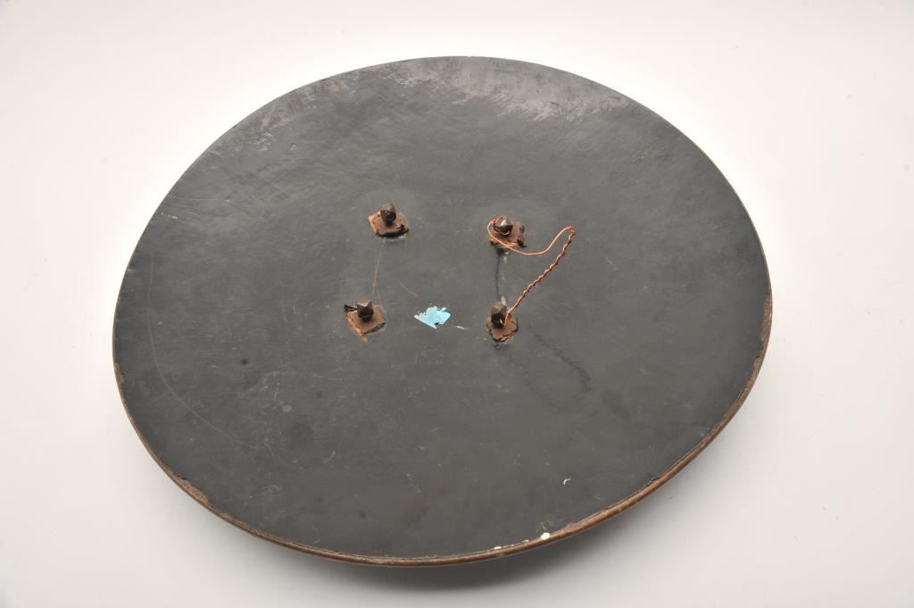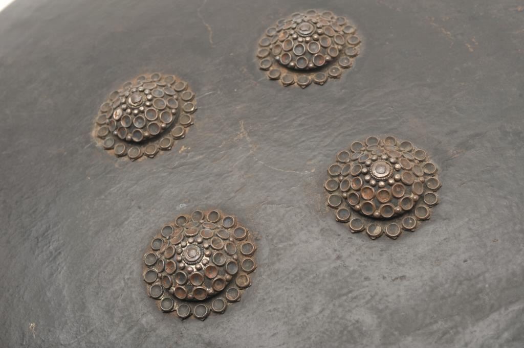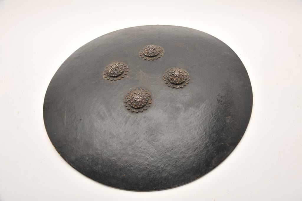 Early to Mid-19th century Indo-Persian shield constructed of thick boiled hide with four fancy metal bosses. Measures 22” across center. Very good plus condition. Est.: $1000-$2000