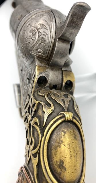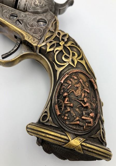 Authentic Colt Conversion of 1861 Navy to .38 caliber centerfire with “Original” Tiffany grips showing Civil War battle scenes, S/N 8875. Fully and finely deluxe scroll engraved by L.D. Nimschke. This Colt remains in very good plus to almost fine condition showing most of its original silver-plated finish toned to natural patina. The markings are sharp, and the edges are crisp with all matching serial numbers. The grips are crisp and well defined and are among the most documented in the Colt collecting world. Provenance: The Charlie Schreiner collection illustrated in full color on page 258 “The Texas Gun Collectors Antique Arm Annual 1971”, “The Colt Engraving Book” (Vol I Page 295), and “The Study of Colt Conversions” by McDowell who describes this revolver “As the most often photographed and most valuable Tiffany gripped Model 1861 factory engraved revolver”. A rare opportunity to obtain a museum quality Tiffany with rock solid provenance and long published history. (Antique) Est.: $25,000-$50,000