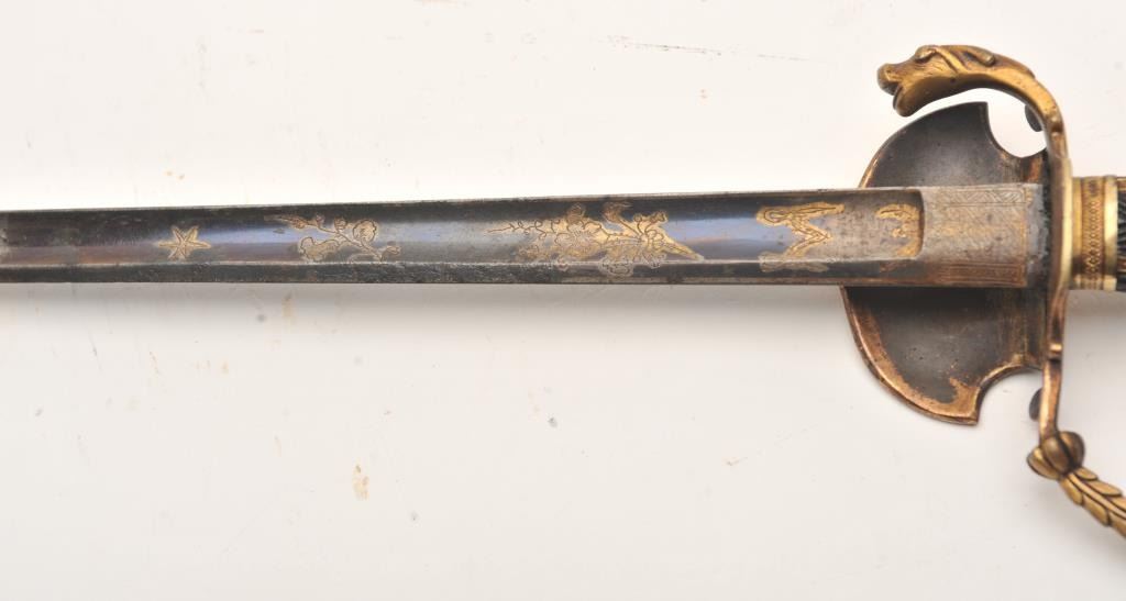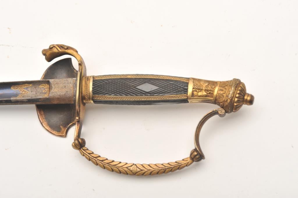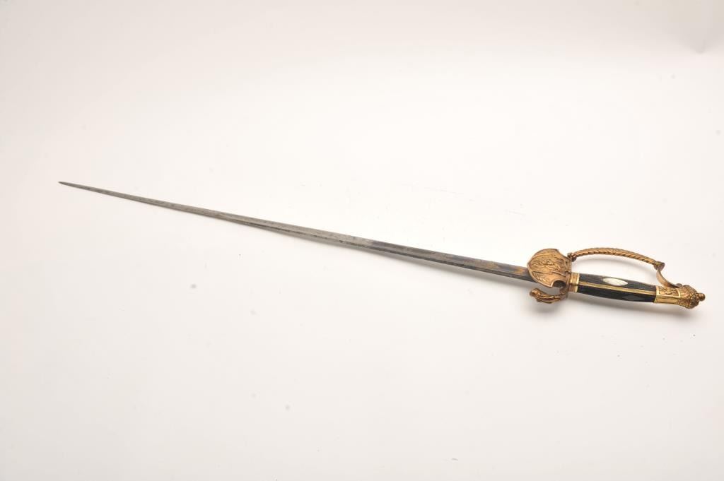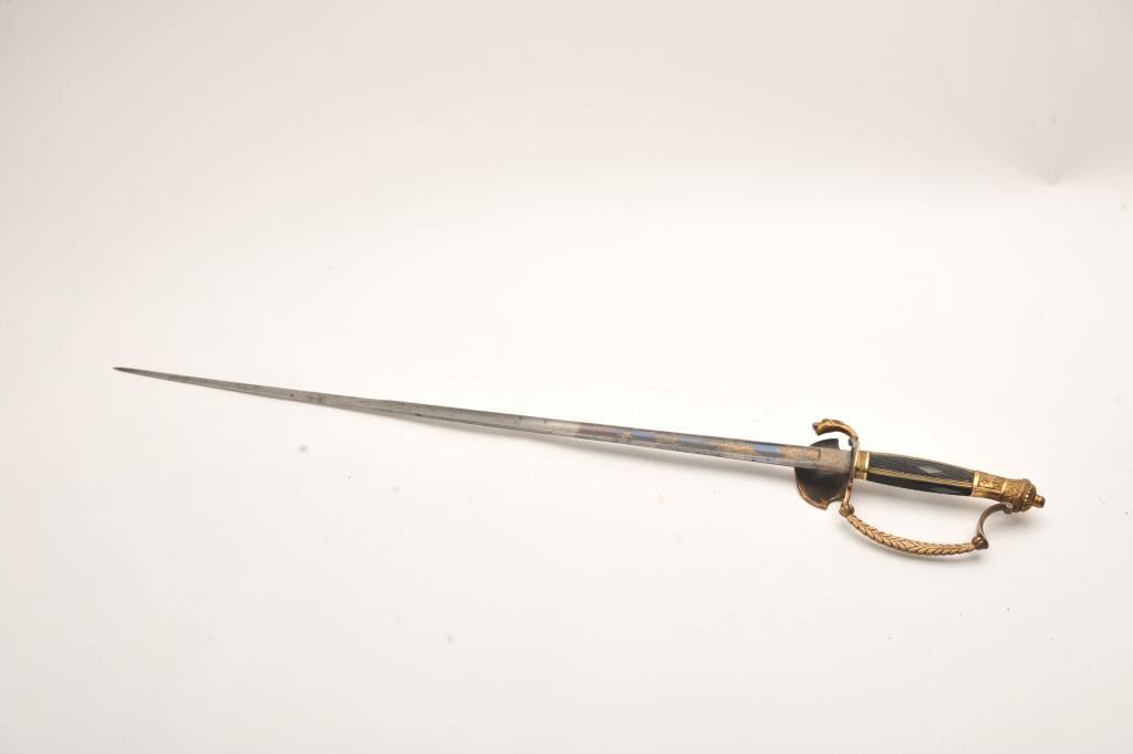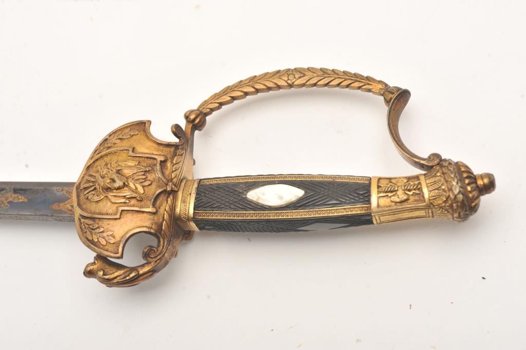 French Mid-19th century small sword with ornate brass gilted mounts. Checkered wood and pearl inlaid grip. Blued and gilt blade. Measures 37” overall. No scabbard. Very good condition. Est.: $250-$500