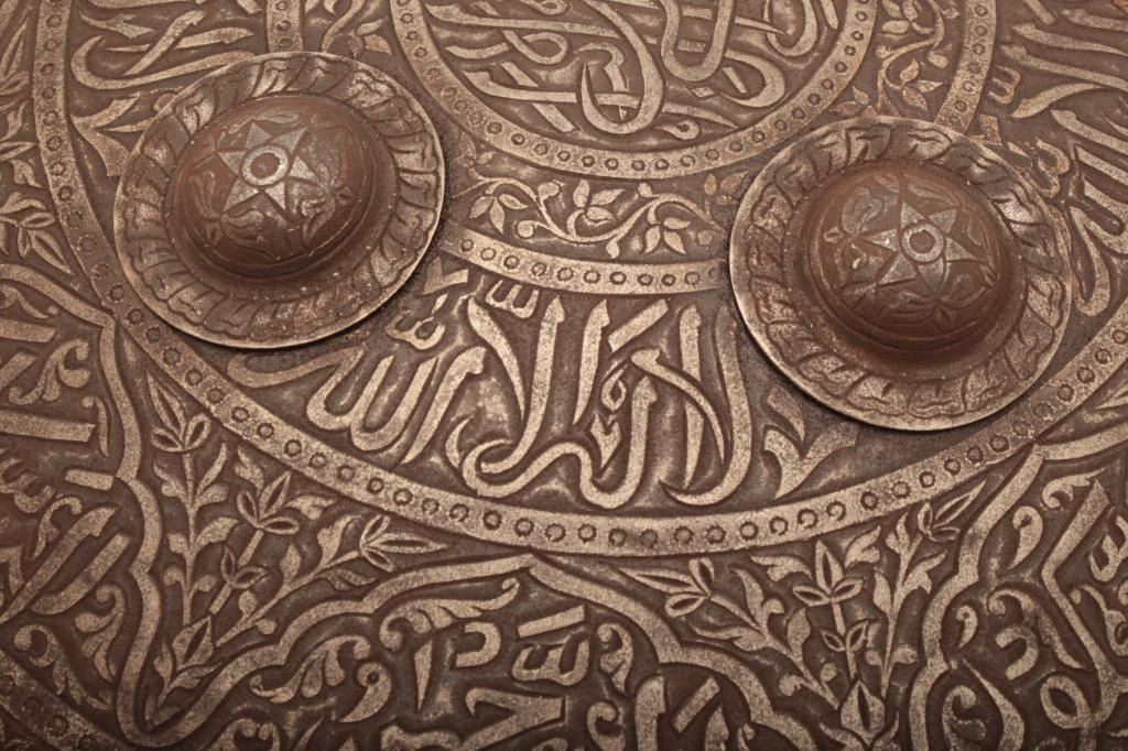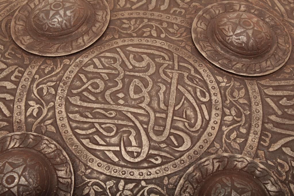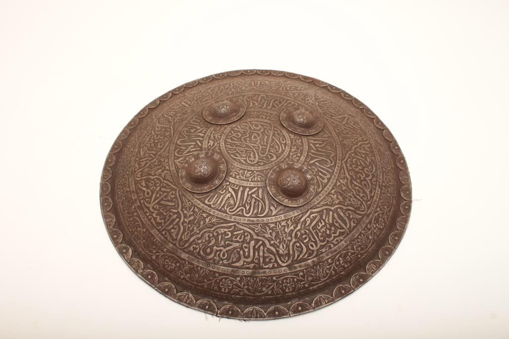 19th to 20th century Indo Persian shield with fancy etched decoration. Measures 18” across the center. Parade type of lighter weight. Est.: $300-$600