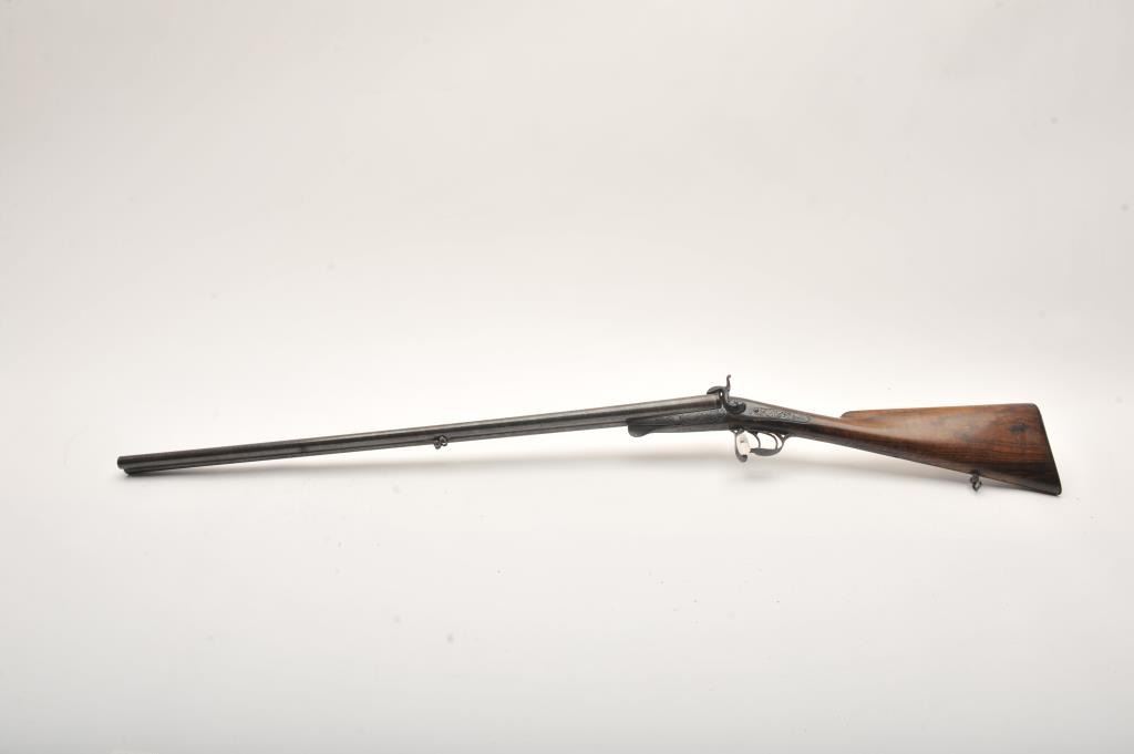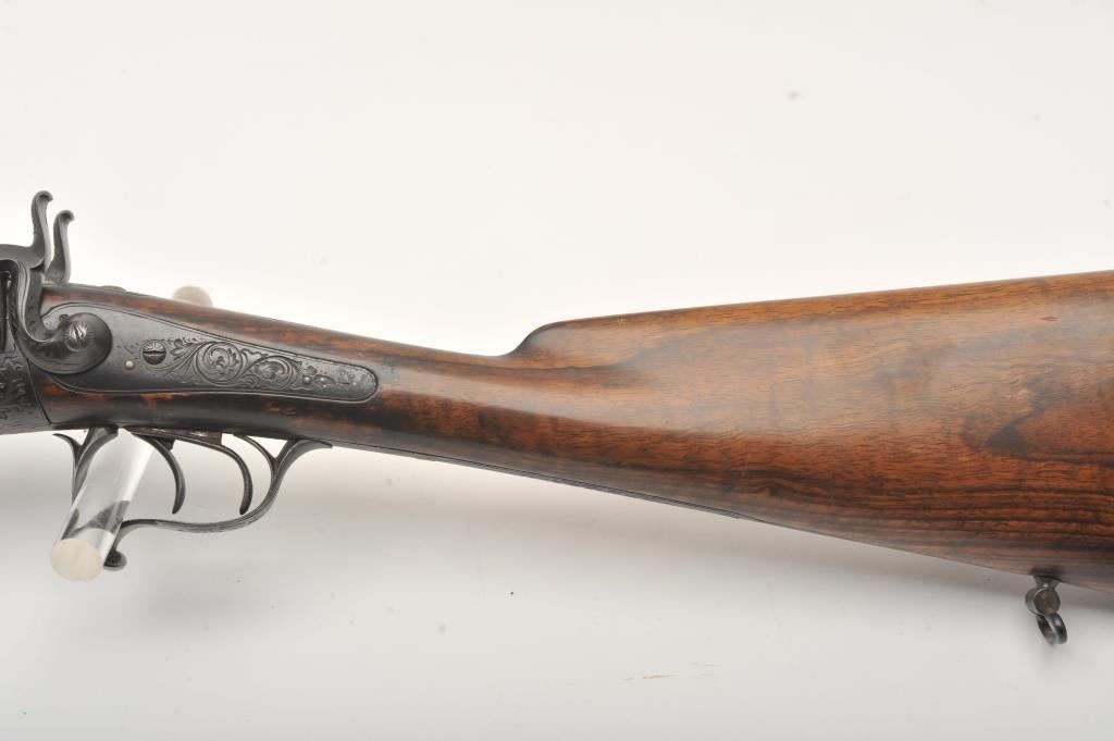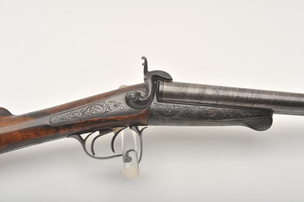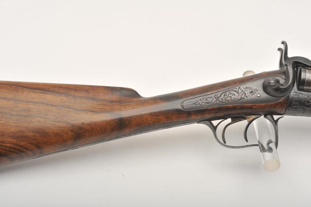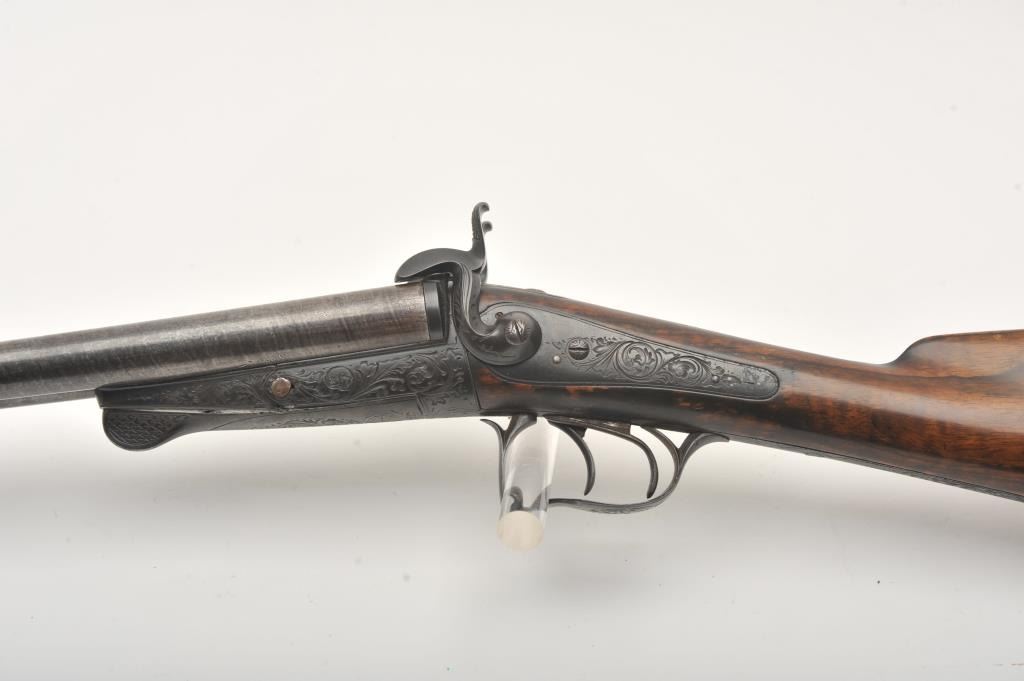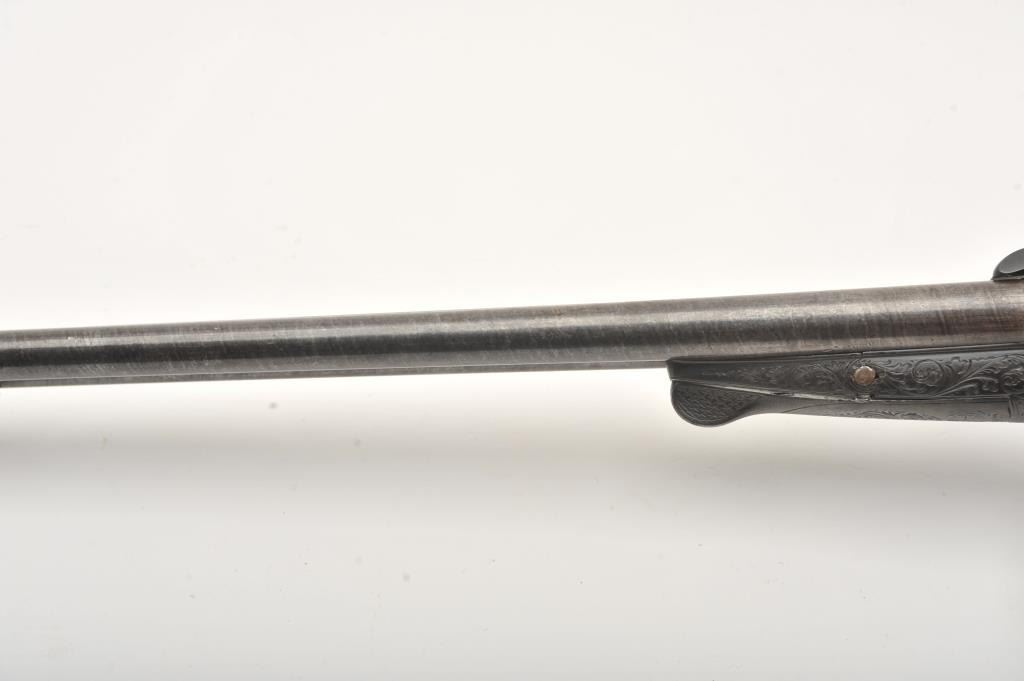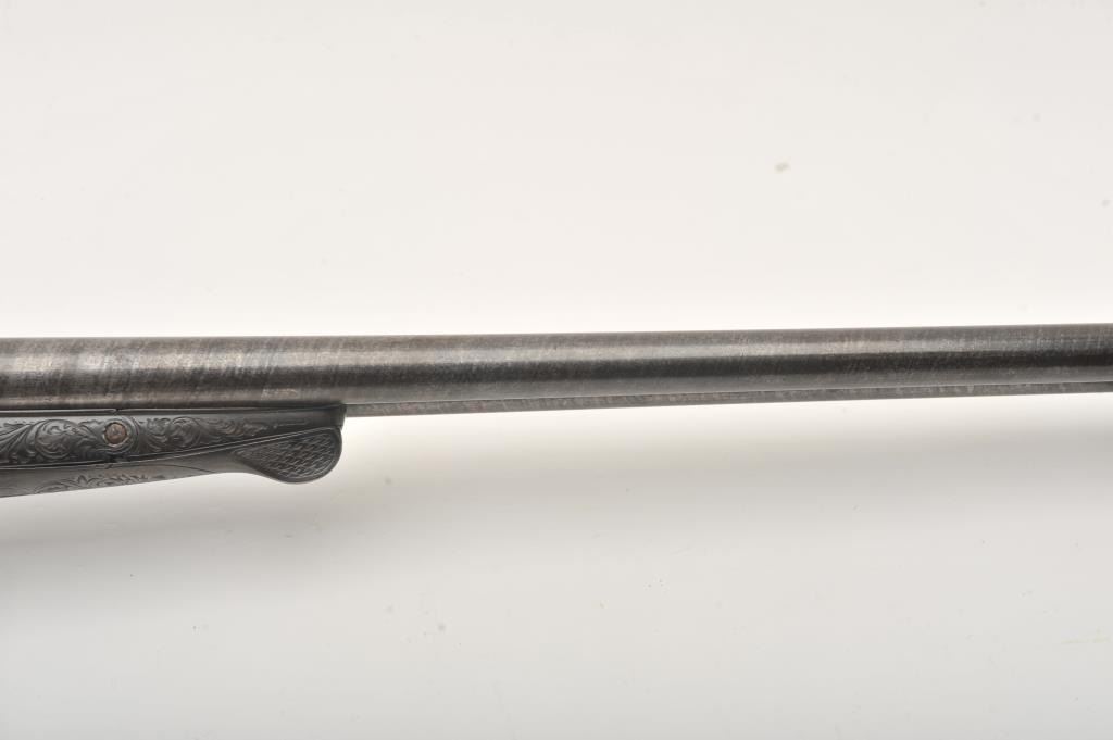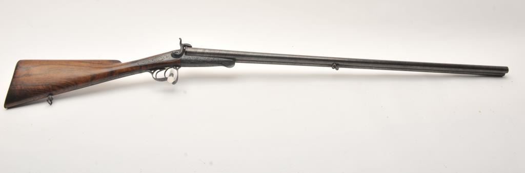 Diminutive 20GA European pinfire SxS shotgun for lady or young squire. Measures 44 ½” overall with 27” barrels. No maker’s marks or proofs but likely French or Belgium. Lightly engraved frame with Damascus barrels and figured wood stock. Very good condition overall. Weighs only about 4.75 pounds. (Antique) Est.: $400-$800