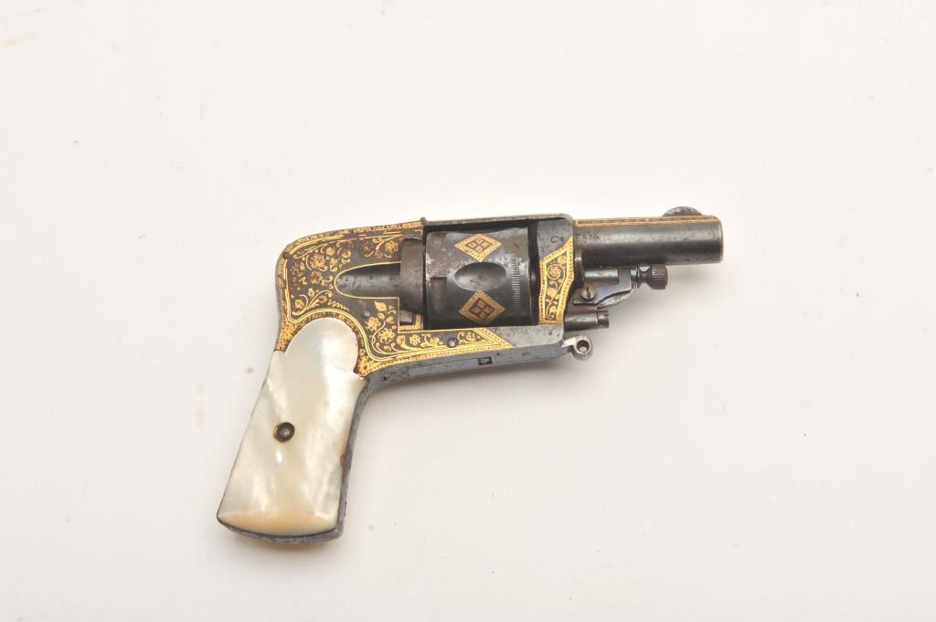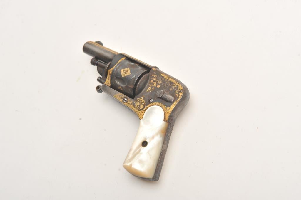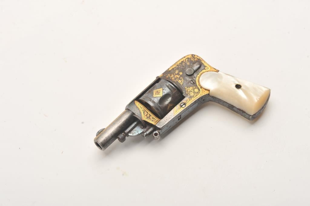 Late 19th century double action pocket revolver in 7.65 short caliber with concealed hammer and folding trigger. Gold damascened decoration with Royal crest on top of the frame. Good to very good condition showing same minor surface rust and erosion and loss of gold. Generally good to very good overall with near fine grips. (Antique) Est.: $400-$800