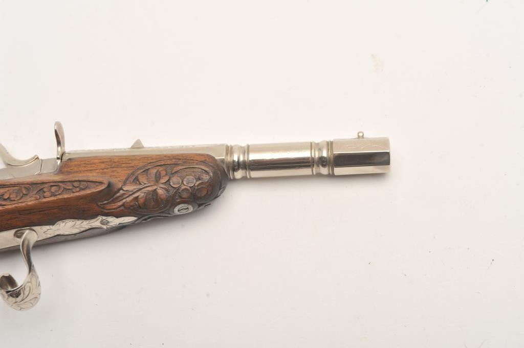 High grade Flobert style 19th century target pistol in .22 cal. by “G Ceirier, Paris”. Engraved and nickel plated with fancy carved stock. Measures 11” overall with a 5 ½” barrel. 95%-98% old re-nickel finish with sharp markings and edges. The bore is fair to poor. A showy pistol with great stock. (Antique) Est.: $600-$1200
