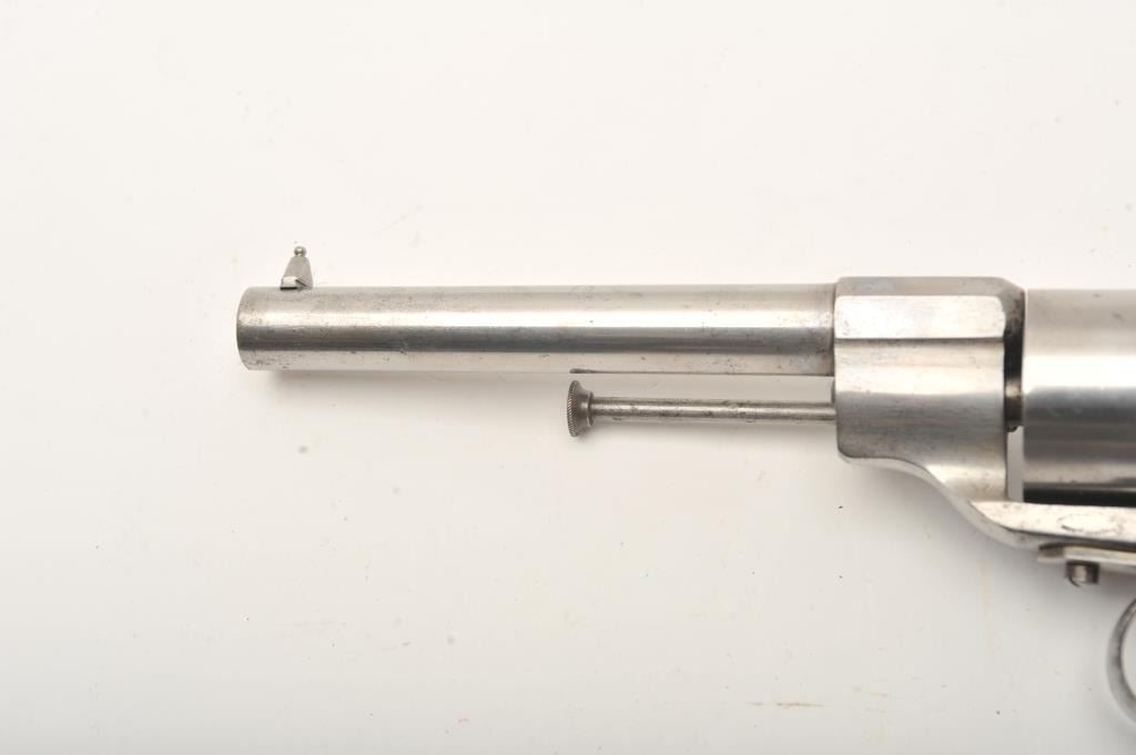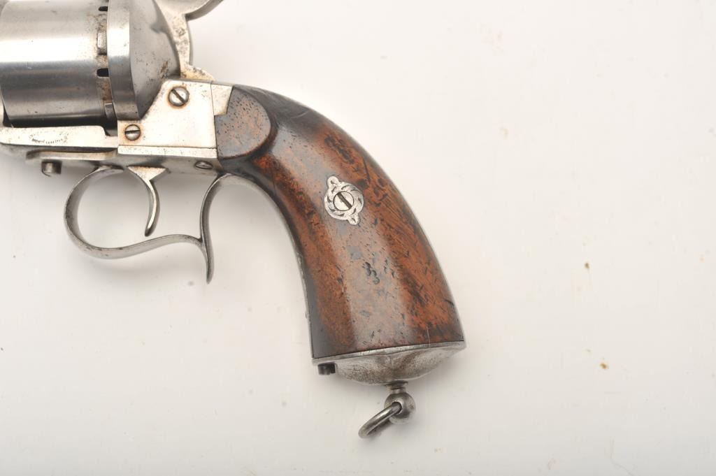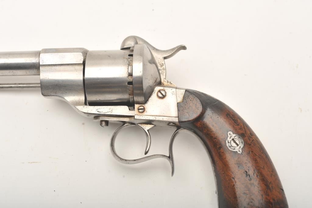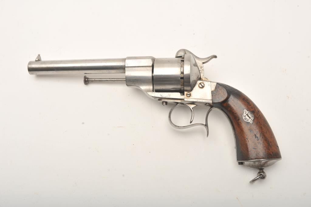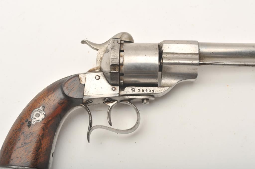 French Military style LeFaucheux single action revolver in 11mm. Measures 12 ½” overall with a 6 ½” barrel. Marked in circular cartouche in center of frame. Very good condition with lightly cleaned gray metal and good grips. Action works well. Classic early French revolver. (Antique) Est.: $400-$800