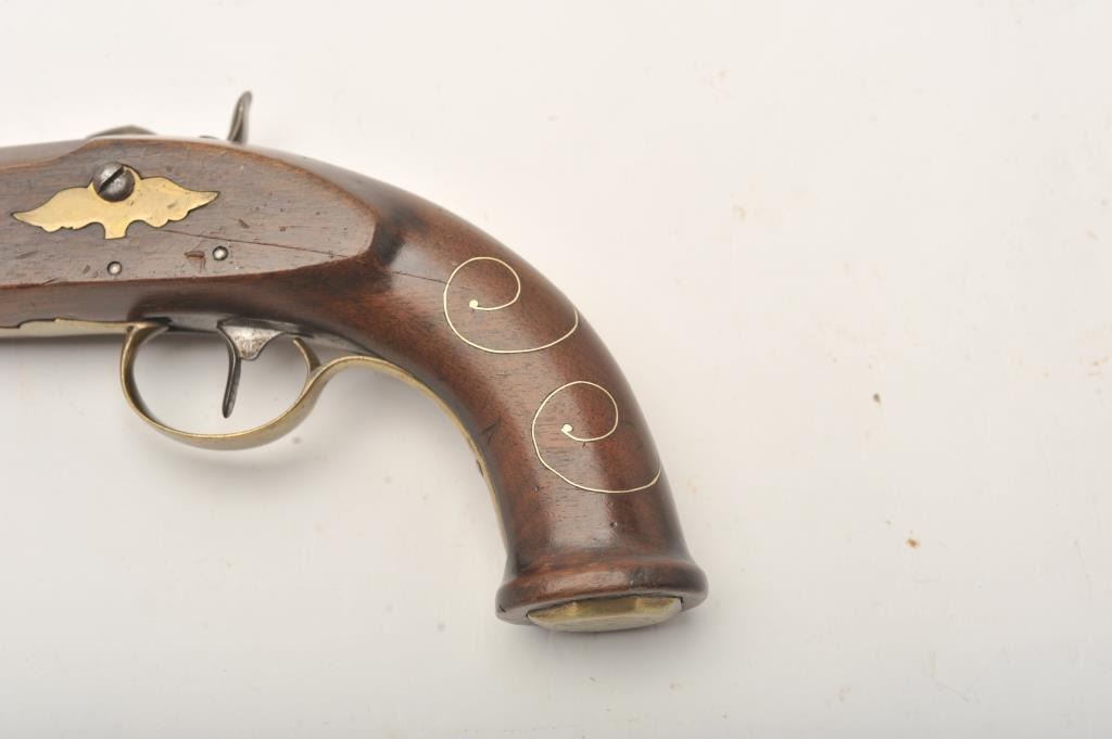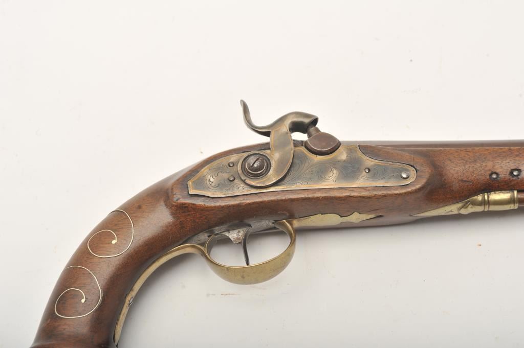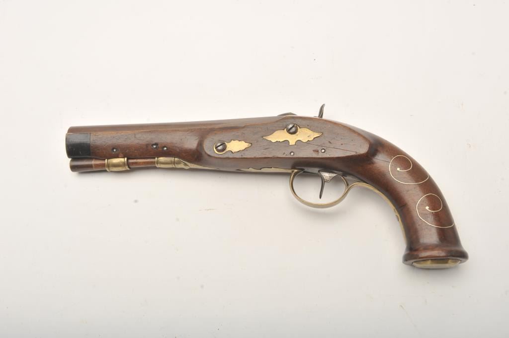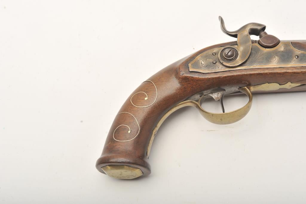 German flintlock belt size pistol converted from flintlock to percussion and signed in gold on the barrel “Goze A Metz”. Measures approximately 12” overall and slightly under 7” barrel of .58 caliber smoothbore. Shows a quality European restoration with brown and case hardened finishes. (Antique) Est.: $350-$700