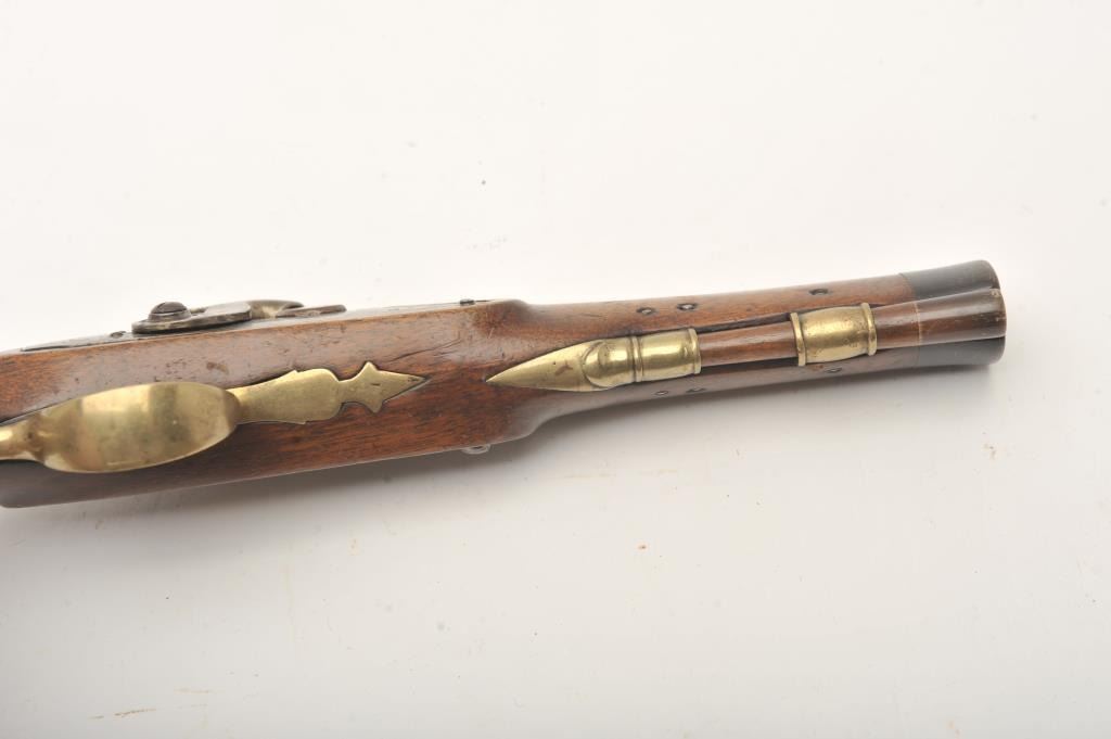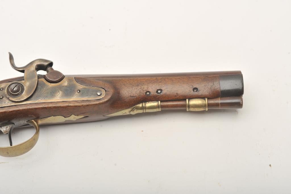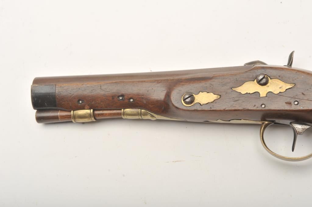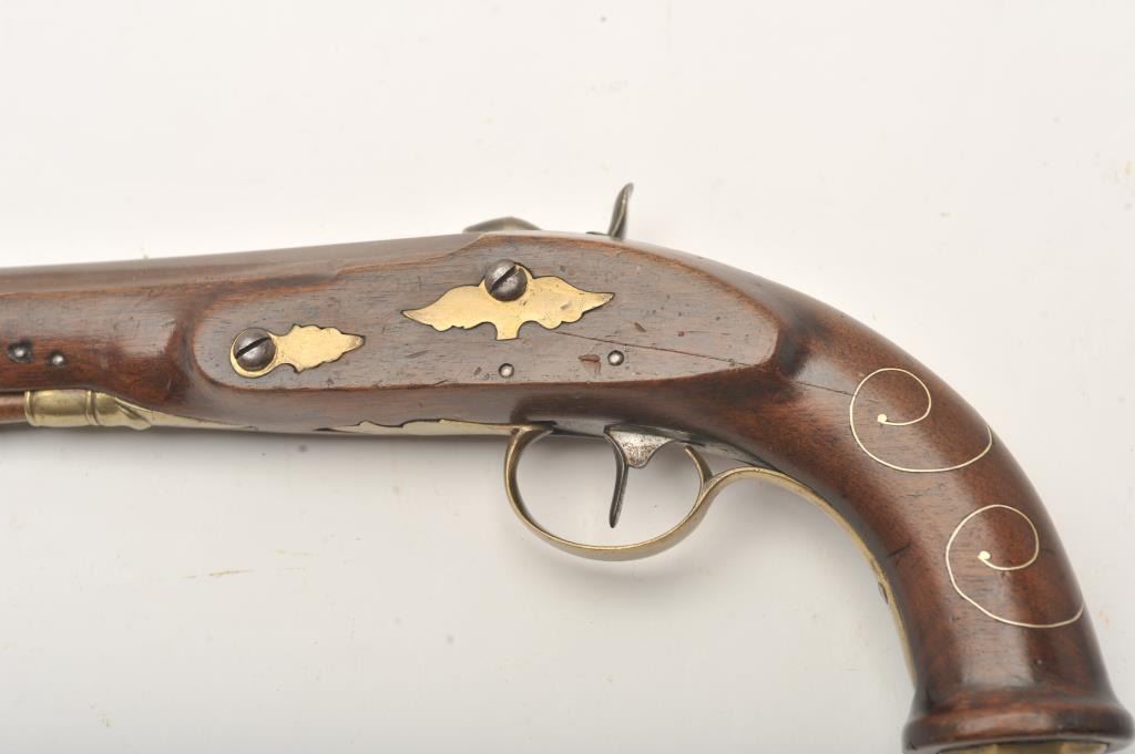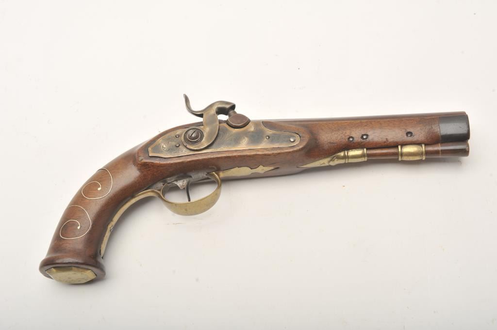German flintlock belt size pistol converted from flintlock to percussion and signed in gold on the barrel “Goze A Metz”. Measures approximately 12” overall and slightly under 7” barrel of .58 caliber smoothbore. Shows a quality European restoration with brown and case hardened finishes. (Antique) Est.: $350-$700