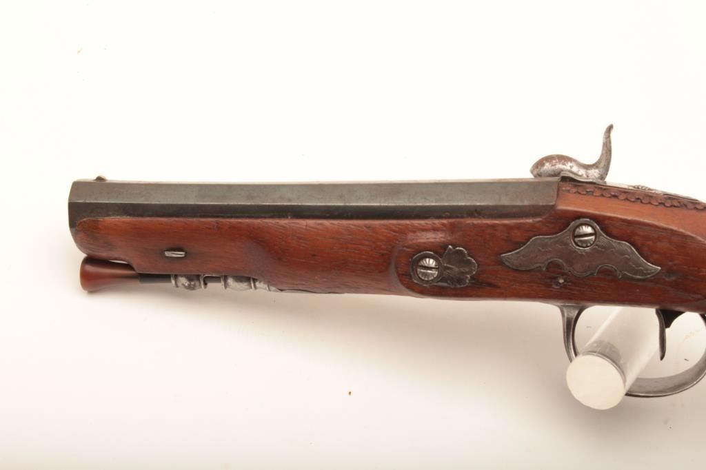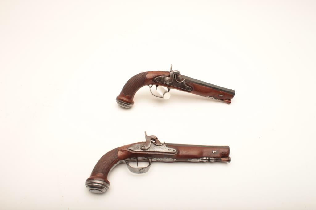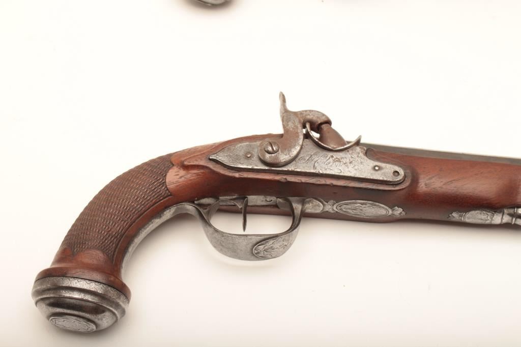Pair of French flintlock Officer’s pistols of Napoleonic era converted to percussion with St. Etienne proofs. 12” overall with 6 ½” octagon barrels of approximately .62 caliber smoothbore. Full stocked with nicely carved and checkered stocks. Locks working. Good to very good overall with proper horn tip ramrods. (Antique) Est.; $750-$1500