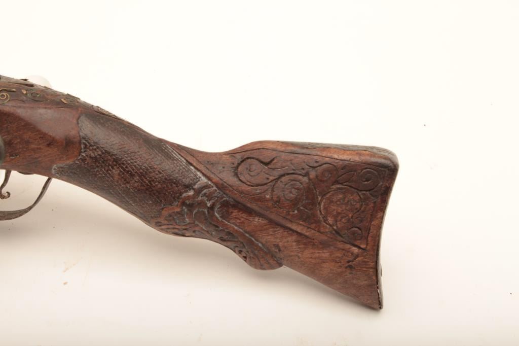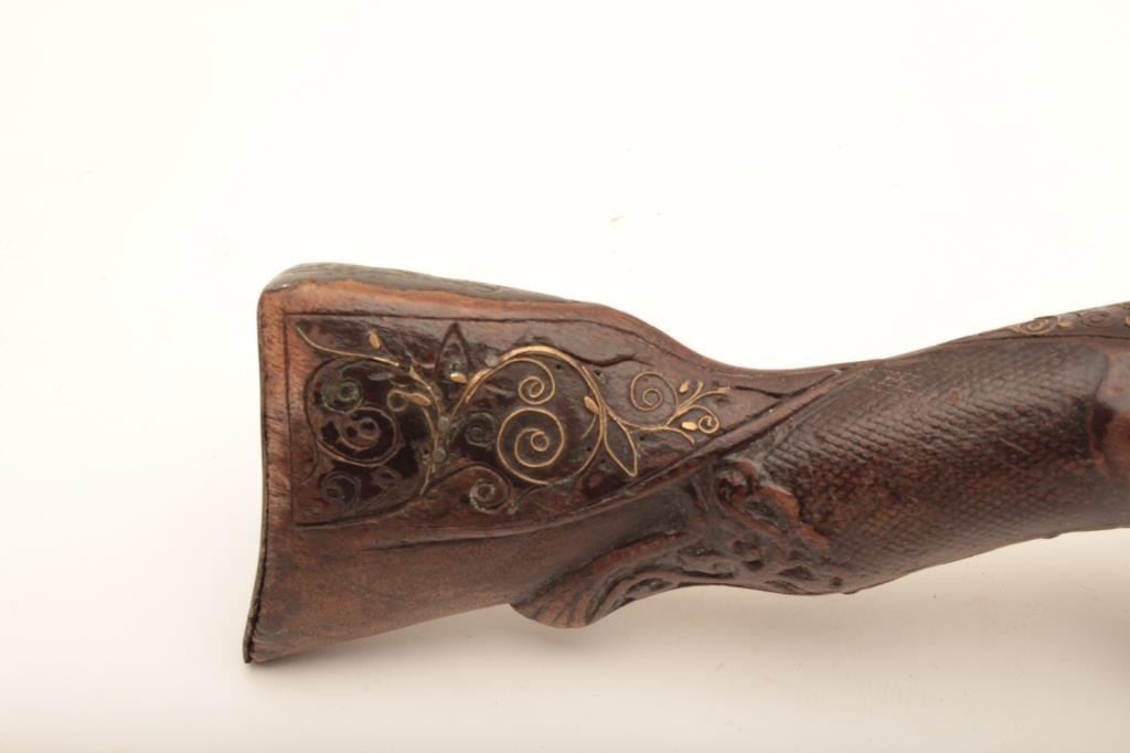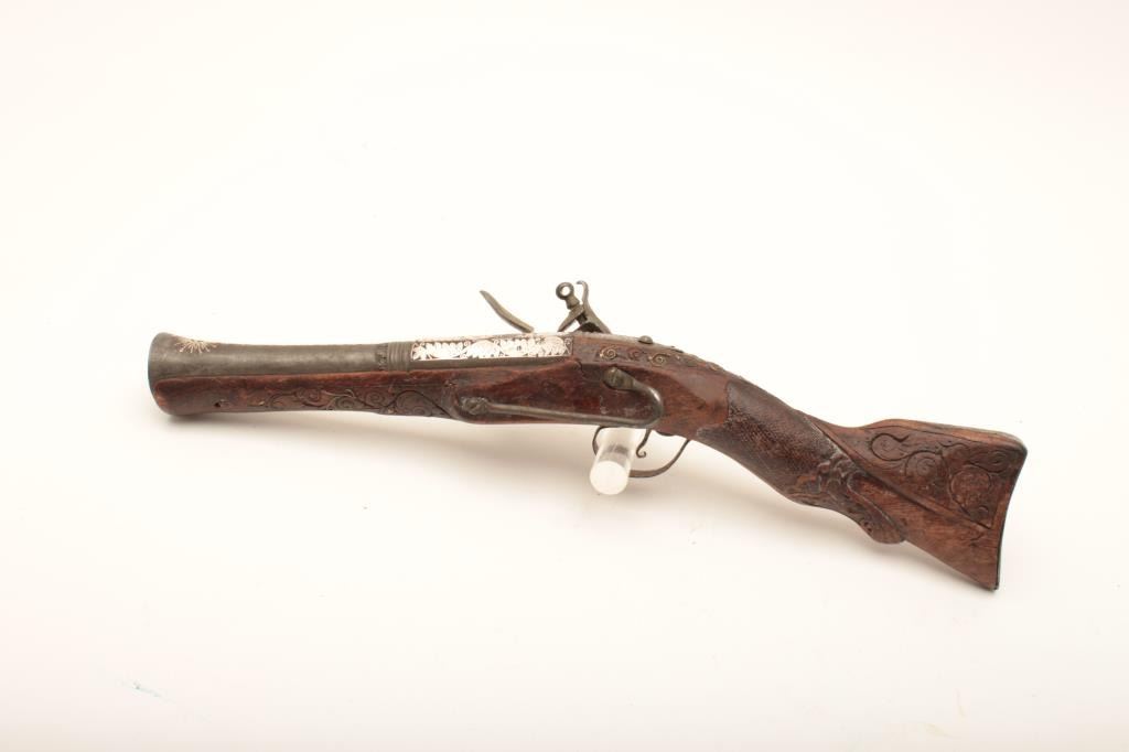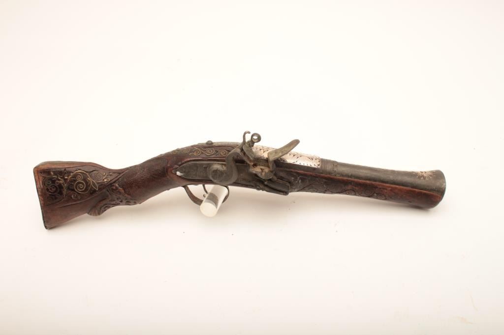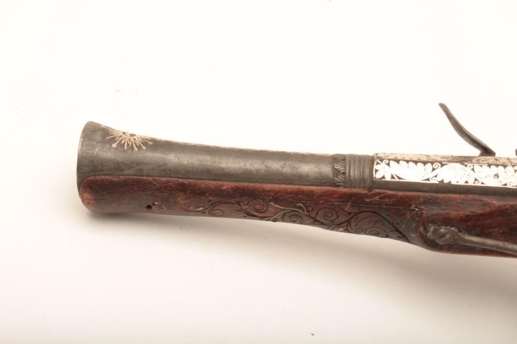Mid-Eastern flintlock dag or blunderbuss with fancy silver inlaid barrel circa 19th century. Measures 18” overall with a 9” barrel flared to 1 ¼” approximately across the inside walls of muzzle. Fair to good overall condition with loss of wire inlay to stock and some wear and small losses and minor damage. The barrel inlaid is nice quality with crescent moon in starburst at muzzle along with fancy scroll. Belt hook retained. Lock works but not perfectly. Name or signature at tang. Genuine to the 19th century with a superior barrel. (Antique) Est.: $400-$800