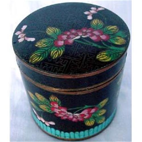 A 19C Cloisonne cigar box and cover. Chinese 19th century. Measures 9.5 X 9.5cm. or 3 3/4" high and diam is 3 3/4". Cylindrical lidded box. Black with a band in turquoise blue and decorated with trailing blossoms. Metal geometric patterning on entire outer surface. The inside is plain sky blue. Underneath black feld. Condition: the enamel is generally in good condition with some minor pieces lacking on the rim of the lid. THe enamel on the bottom is worn.