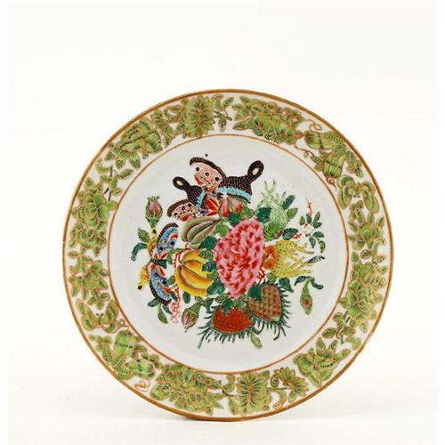 <table width="100%" border="0" cellspacing="0" cellpadding="4"><tr><td><em> </em></td></tr><tr> <td width="100%"> Late 19th Century or Early 20th Century Chinese Export Enamel Famille Rose Fitz Hugh Border Plate with Fruits Motif <p> It is 1 inch tall by 8.5 inches in diameter.</p><p> It is in good condition with no repairs, nor chips, except rubbing of gold, and manufacture defect of firing crack at the back.</p>