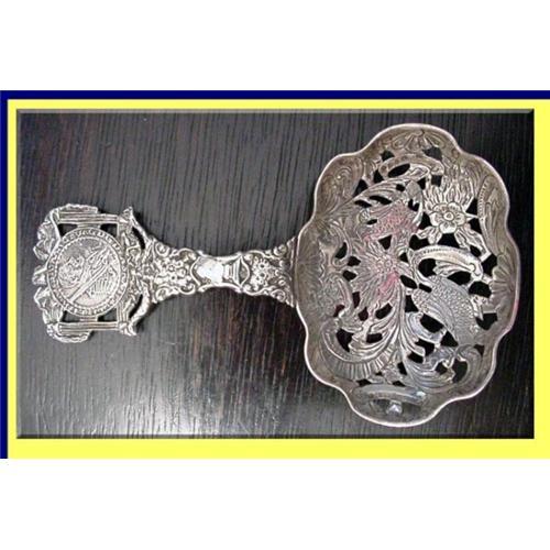 Wavy border with gentle scalloped sides. Great openwork highlighted with very fine engraved detail and highlights. BIrds, flowers and scrolling foliage in the bowl. The handle has two moulded mardinieres of flowers and leads to an old silver coin set within a dramatic folded frame. <P>