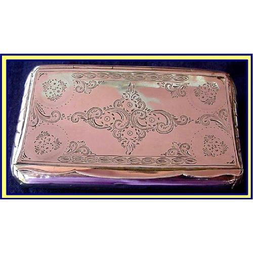 Magnificent chased and bright cut silver cigar case. Holland c1876.<BR>Measures a little under 5 1/2inches long and is 3 1/4inches wide. Weighs 145g.<BR>Curved rectangular shape, convex on the bottom and concave on top. Sides engraved and rounded to look like folds. Top and bottom very beautifully engraved and bright-cut with flowerheads and scrolling foliage. Scalloped protruding thumb piece along entire front edge. Hinged cover in excellent shape, is engraved on the inside with the initials A.P.<BR>Hallmarks on every surface. <BR>Good condition.