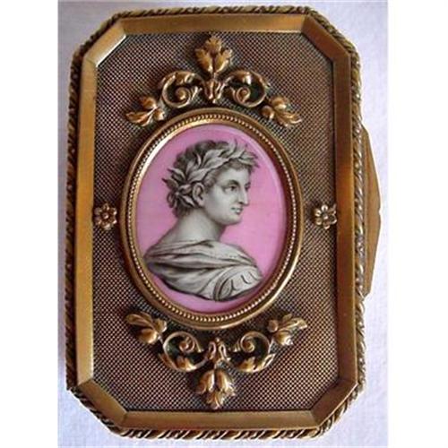 Fabulous French bronze box with marvellous handpainted grisaille enamel portrait on porcelain. Probably Napoleon in Roman emperor attire. Measures 3 1/4 X 2 1/4inches. Canted corners. Sides with delicate, gilded raised scrolling design. Top has applied fleur de lis scrolling leaves and flowers. The center of the lid has a pink medallion with a wonderful grisaille handpainted portrait of a Roman emperor, laurel crown. Very likely a view of Napoleon Bonaparte. Fantastic detail. Hinges firm. Inside been re-lined in pink silk. Box closes tightly. No damage of any sort.