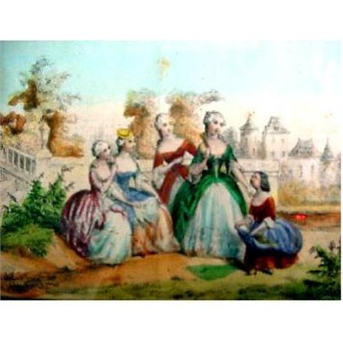 Handcoloured miniature lithograph, made in France. A meeting in the large garden of people dressed in 18th century garb. One of a set of 12. <P><P> Measurements: 5 1/2" X 3 3/4". <P><P> 4 finely dressed ladies, at the bottom of a flight of stair leading down to a large garden, meet up with a little girl, her apron filled with berries. A castle is lightly depicted in the background. Very pretty depiction of plants and foliage and very fine detail of faces, clothes and hair. Watercolour brushstrokes are quite clear. <P><P> COndition: general condition is very good with one or two very minor age marks that can be professionally removed. No tears or rips. <P><P>