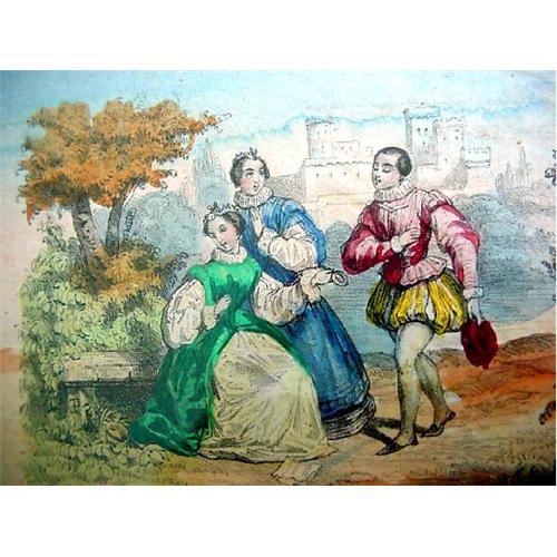 Handcoloured miniature lithograph, made in France. A a meeting in a pastural scene of people dressed in 18th century garb. One of a set of 12. <P><P> Measurements: 5 1/2" X 3 3/4". <P><P> Two finely dressed ladies, sitting on a bench meet up with a young man / troubador in a pastoral setting. A city is lightly depicted in the background. Very pretty depiction of plants and foliage and very fine detail of faces, clothes and hair. Watercolour brushstrokes are quite clear. <P><P> COndition: general condition is very good. No tears or rips. <P><P>