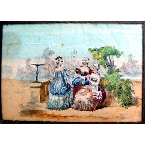 Handcoloured miniature lithograph, made in France. A group of 3 people dressed in 18th century attire amidst a pastoral setting with architectural ruins. One (#8) of a set of 12. <P><P> Measurements: 5 1/2" X 3 3/4". <P><P> 3 ladies meet outside and engage in a lively discussion, gesticulating at something in the distance. A turreted castle is lightly depicted in the background. Very pretty depiction of plants and foliage and very fine detail of faces, clothes and hair. Watercolour brushstrokes are quite clear. There appear to be 3 initials amidst the foliage: TAG. <P><P> COndition: good.