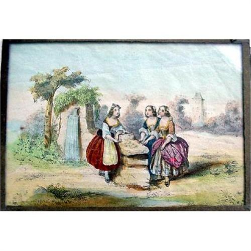Handcoloured miniature lithograph, made in France. A group of 3 people dressed in 18th century attire amidst a pastoral setting with old architectural ruins. One (#6) of a set of 12. <P><P> Measurements: 5 1/2" X 3 3/4". <P><P> 3 young ladies meet and chat at a low wall.Beautiful 18th century clothes. Buildings lightly depicted in the background. Very pretty depiction of plants and foliage and very fine detail of faces, clothes and hair. Watercolour brushstrokes are quite clear. <P><P> COndition:very good.