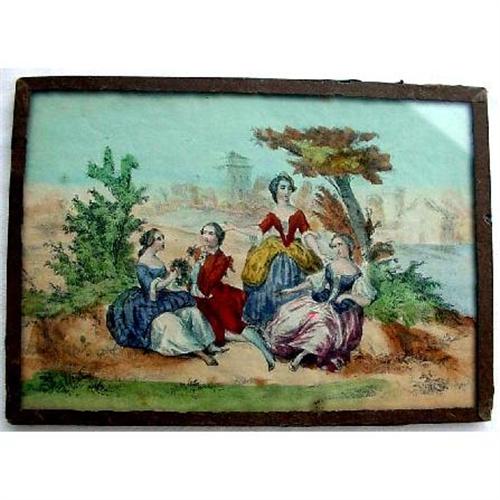 Handcoloured miniature lithograph, made in France. A group of 4 people dressed in 18th century attire amidst a pastoral setting. One (#5) of a set of 12. <P><P> Measurements: 5 1/2" X 3 3/4". <P><P> Group of 4 people engage in leisurely pursuits in a pastoral setting. A suitor offers flowers to one lady, while two others sit nearby. A group of buildings is lightly depicted in the background. Very pretty depiction of plants and foliage and very fine detail of faces, clothes and hair. Watercolour brushstrokes are quite clear. <P><P> COndition: very good.