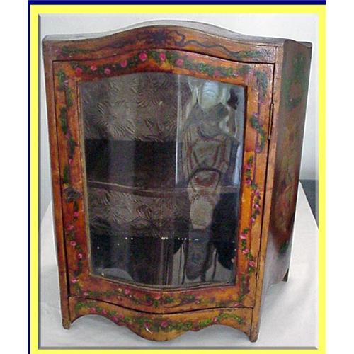 Antique miniature table display cabinet / vitrine in the Louis XV Rococo style with painted cherubs and flowers. Made late 19th century.<BR>Measures a little over 15 1/2inches high. Wider back is 14 1/2inches accross and front is 10 inches accross. <BR>Serpentine form with curved glass door and original key.<BR>Tope and sides are painted with cherubs, flowers and scrolls.<BR>Good condition.