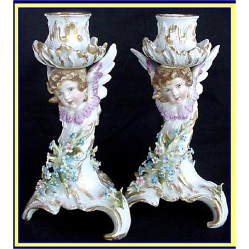 Pair of Art Nouveau candlesticks in the form of angles / winged cherubs with applied flowers, made by the Plaue factory owned by Schierholz, in Plaue Thuringia, late 19th century.<BR>(the factory operated 1880-1906). Meissen quality.<BR>Measure 6 3/4inches high.<BR>Each candlestick stands on an ornate swirling tripod base, richly adorned with applied flowers in pink and blue with green stems. Richly highlighted in gold. A beautifully modelled angelic <BR><BR>face with blond curls and puce wings supports a flowerform drip pan, and acanthus moulded candlestick, again with rich gilding.<BR>Each stick is marked with a double crossed line, somewhat in immiatation of the Meissen mark. One stick also has an impressed number 42.<BR>Condition is excellent. Blacklight shows no restorations. One or two missing petals - absolutely negligible and difficult to find are the only faults we could find.