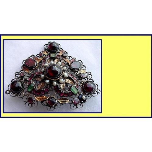 Extraordinary brooch made 19th century, Austro-Hungary or possibly France. <BR>Measures 2 1/8inches accross.<BR>A scrolling silver filigree openwork mount, triangular in shape, supports a number of gold leaves, pearls and gemstones. A central large cabochon garnet surrounded by 10 pearls, raised to a higher level than the rest of the brooch. From here 3 horse-shoe shaped rings of rubies, each with a rectangular emerald in the arch, intersperced with gold, moulded and engraved leaves. The exhuberant design continues less formally with a variety of rubies, garnets and even a small black enamelled flower on one side, set with another small pearl. 3 cabochon garnets set in the corners of the triangle.<BR>Very good condition. Apparrently unmarked.